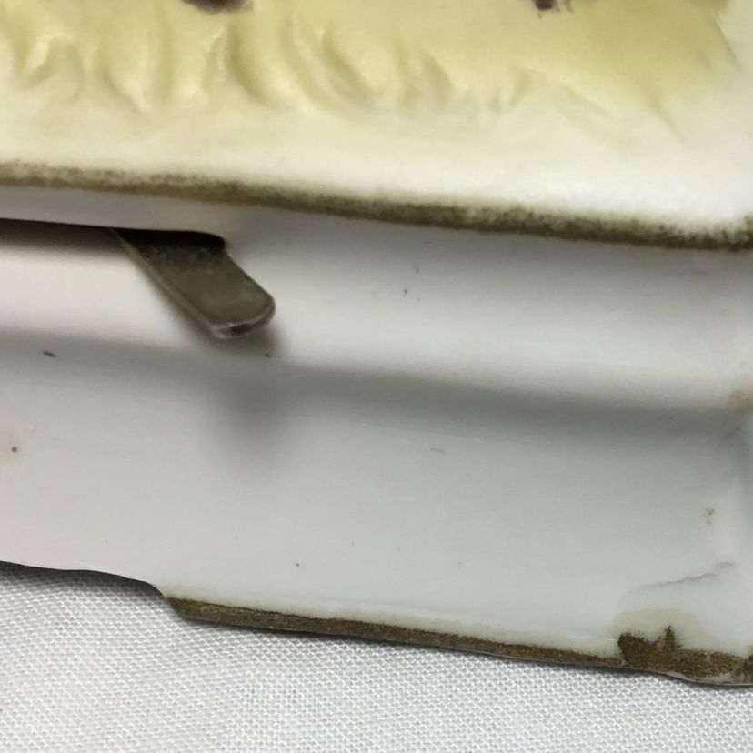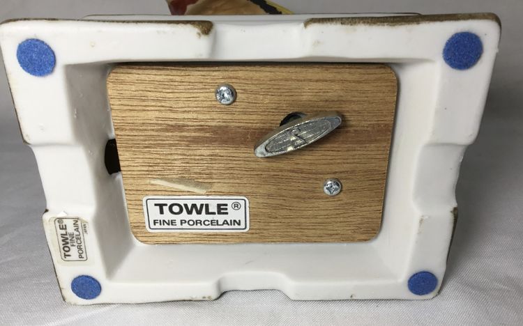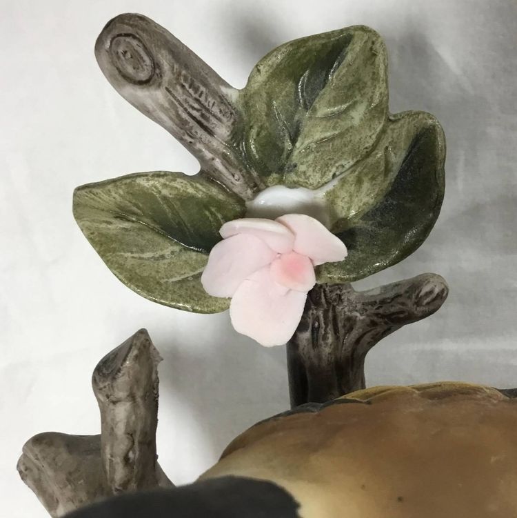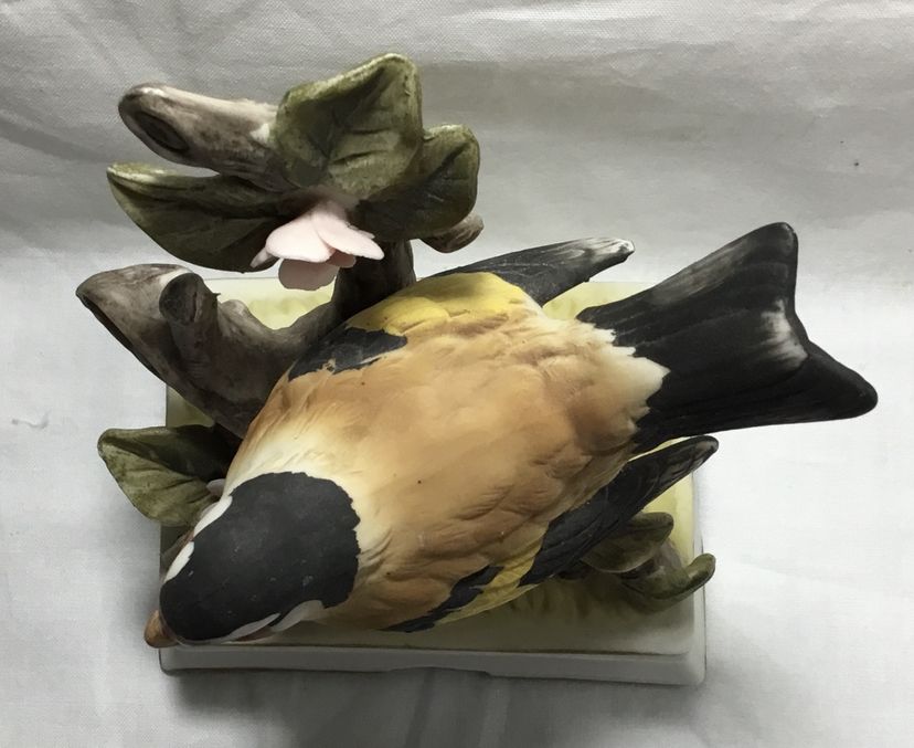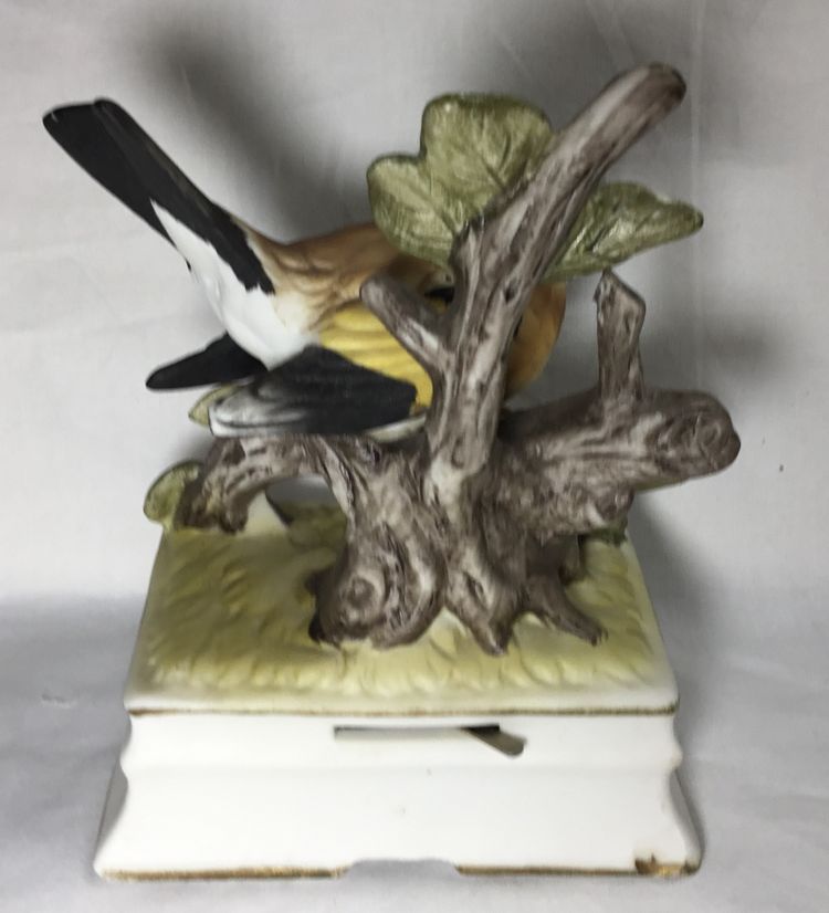 6 inches tall by 4.5 inches wide by 3.25 inches front to back, porcelain figure of European goldfinch on a branch with two pink flowers. Bird has red face, black cap, golden brown body, mostly black tail, black wings with yellow stripe in the middle. Music box works well and plays, "Oh, What a Beautiful Morning." One flower missing a petal, flat chip on BACK side of base. See all photos.