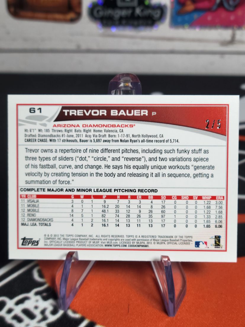2013 Topps Baseball Mini Trevor Bauer Black parallel, card #61, serial numbered 2 out of only 5 produced. An extremely scarce low-print parallel from the 2013 Topps Mini release — one of the rarest Bauer cards available. True /5 mini blacks from this era are highly sought after by low-number collectors and team/player specialists.