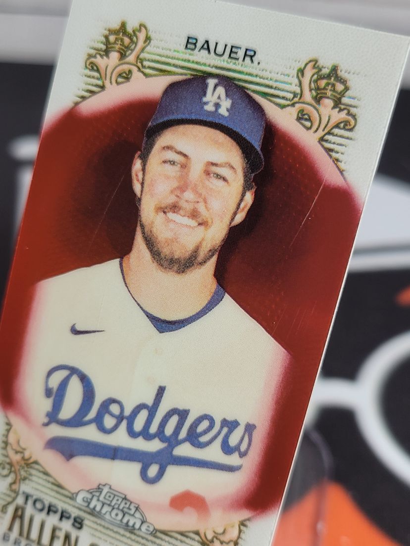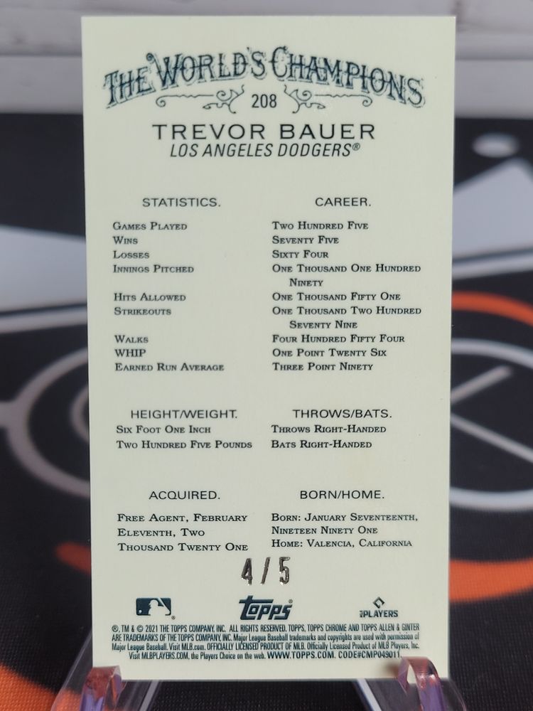 2021 Topps Allen & Ginter Chrome Mini #208 featuring Trevor Bauer, serial-numbered /5 (Red Mini Refractor). This ultra-low-print parallel offers a striking visual finish and strong scarcity value for the Bauer collector or low-number chase card specialist.