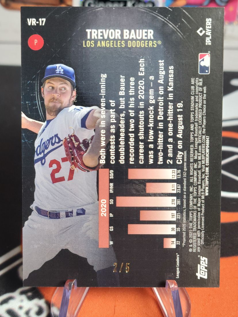 2021 Topps Stadium Club Virtual Reality Trevor Bauer Red Refractor, card #VR-17, serial numbered 2 out of 5. This ultra-rare low-numbered parallel showcases Bauer in the innovative VR subset from Topps Stadium Club, featuring a vibrant red refractor finish. A premium chase card for collectors of limited parallels and early Bauer inserts.