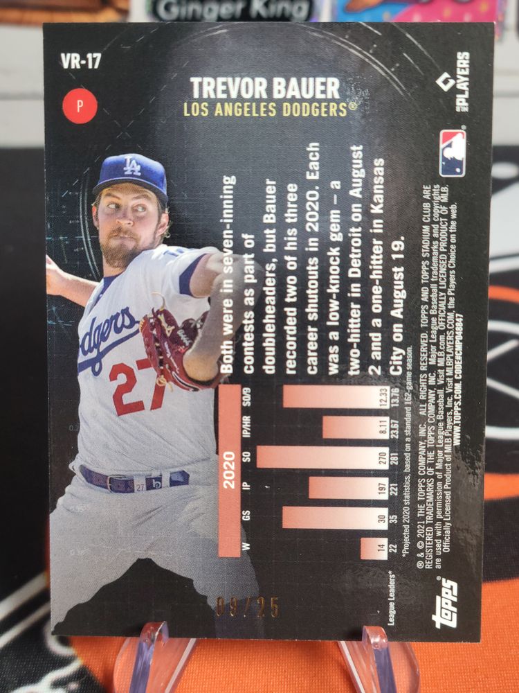 This listing is for the 2021 Topps Stadium Club Chrome Virtual Reality VR-17 Trevor Bauer Orange Refractor, serial numbered 9/25. This parallel is part of the limited-edition Orange Refractor series, offering collectors a rare and visually striking version of this insert card. The card features Bauer in his Dodgers uniform, showcasing the innovative design of the Virtual Reality subset.