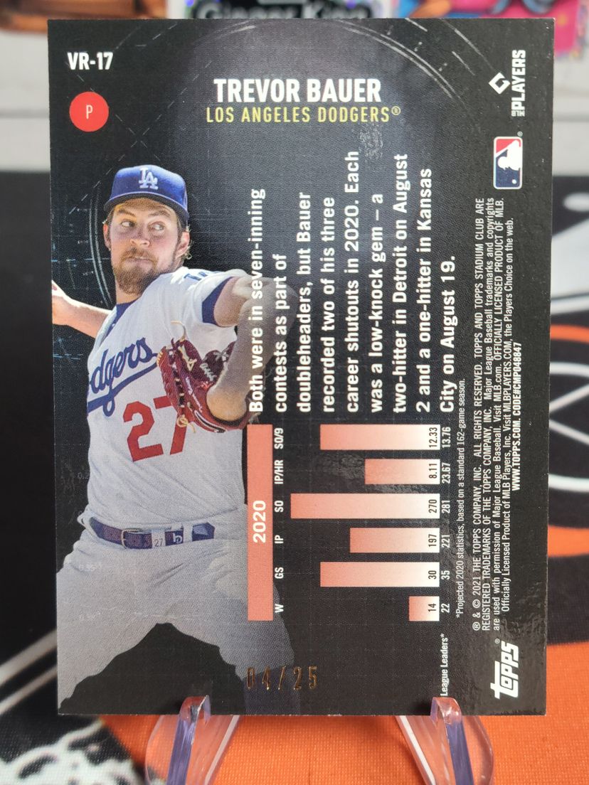 This listing is for the 2021 Topps Stadium Club Chrome Virtual Reality VR-17 Trevor Bauer Orange Refractor, serial numbered 4/25. This parallel is part of the limited-edition Orange Refractor series, offering collectors a rare and visually striking version of this insert card. The card features Bauer in his Dodgers uniform, showcasing the innovative design of the Virtual Reality subset.