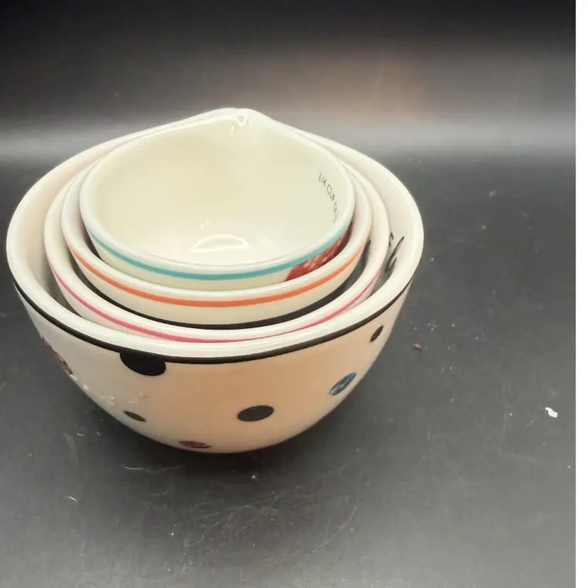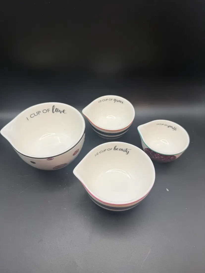 These particular cups are inscribed with whimsical phrases like "1 CUP OF love," "1/2 CUP OF beauty," "1/3 CUP OF grace," and "1/4 CUP OF sparkle," The designs, from polka dots to stripes and speckles, give a sweet vibe to your kitchen