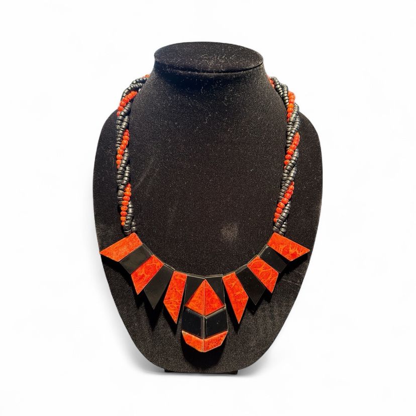 Stand out with this eye-catching statement necklace! Featuring layered strands of red and black beads and bold geometric pendant pieces, this necklace instantly adds drama to any outfit.