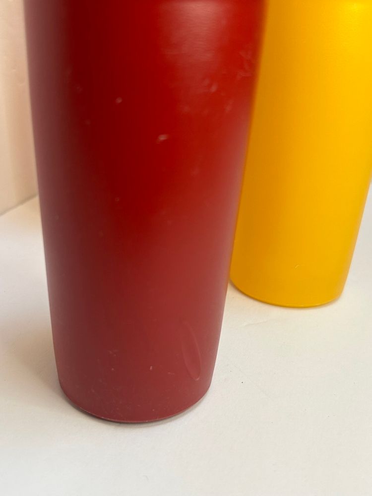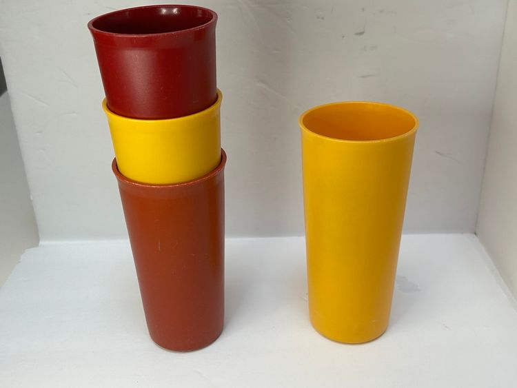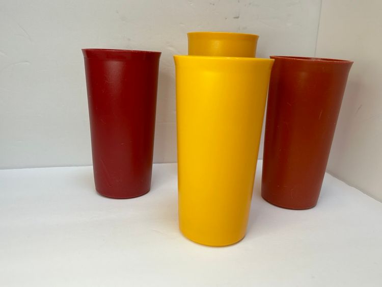 This set of four Tupperware Harvest Colors tumblers are perfect for any occasion, whether it's a family dinner or a backyard barbecue. The round shape and solid pattern make them a classic addition to any table setting. These cups can hold cold beverages and are made of durable plastic, ensuring long-lasting use. The vintage design adds to their charm, making them a unique addition to any collection. Perfect for families, teens, and unisex adults and kids.