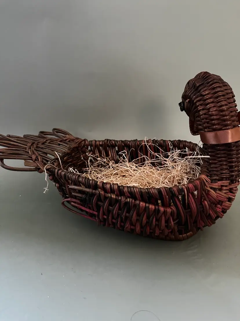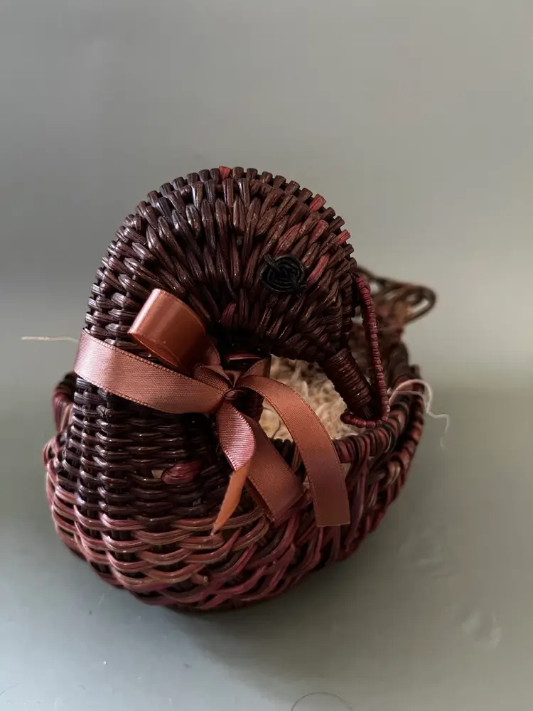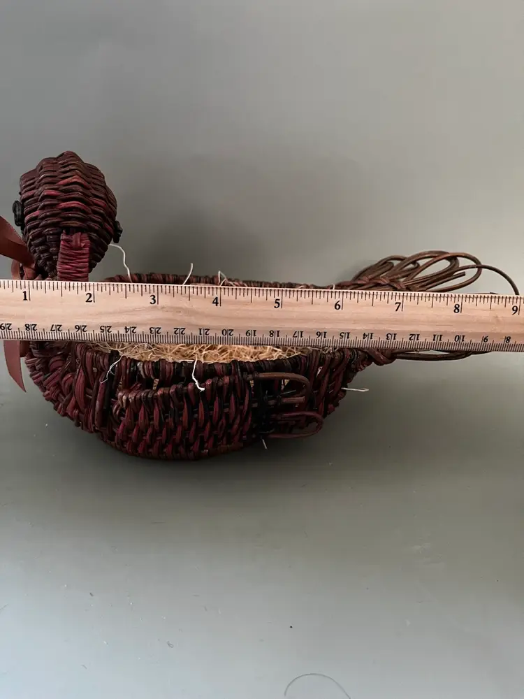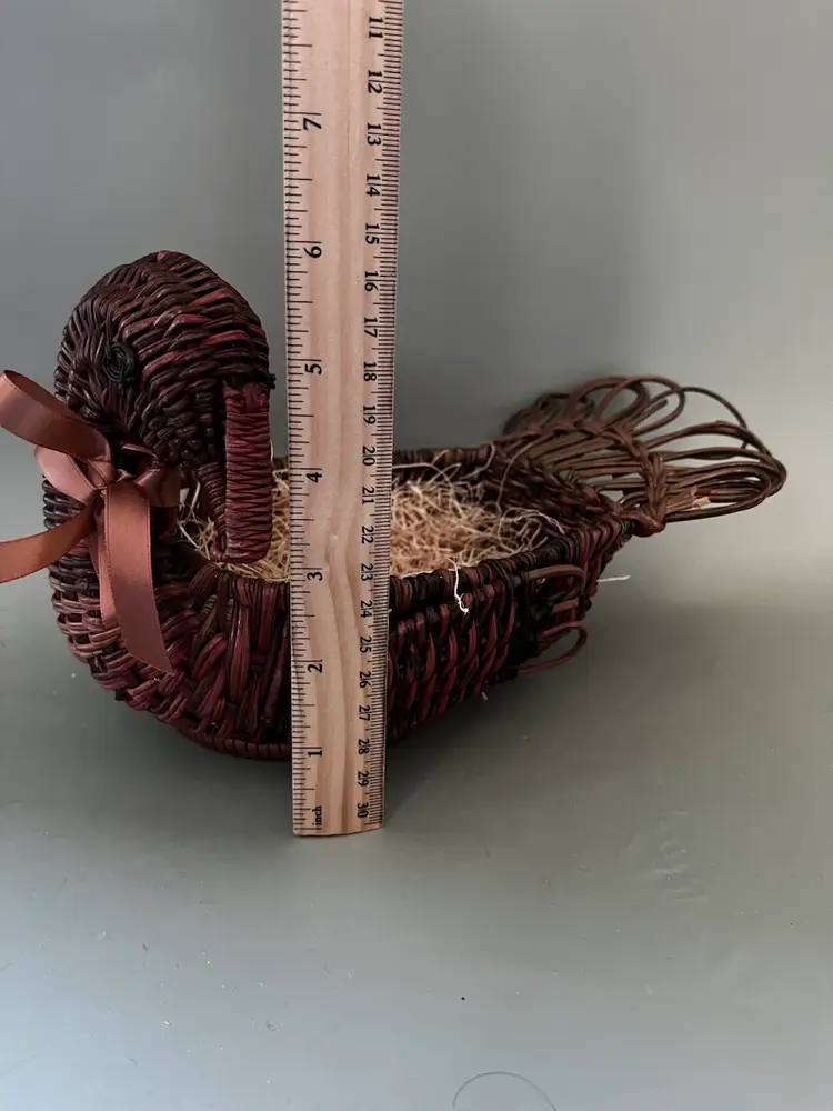 This vintage Thanksgiving-themed turkey wicker basket is a charming addition to your holiday decor. Made of dark wicker, this small display basket features a unique turkey shape, perfect for adding a touch of farmhouse style to your indoor space. With a single compartment and free-standing design, this 9-inch centerpiece is ideal for showcasing holiday-themed items or as a decorative element in your home. Its brown color and animal-themed design make it a perfect choice for celebrating Thanksgiving.