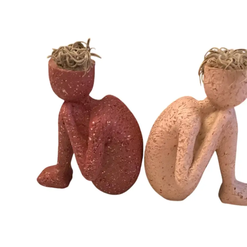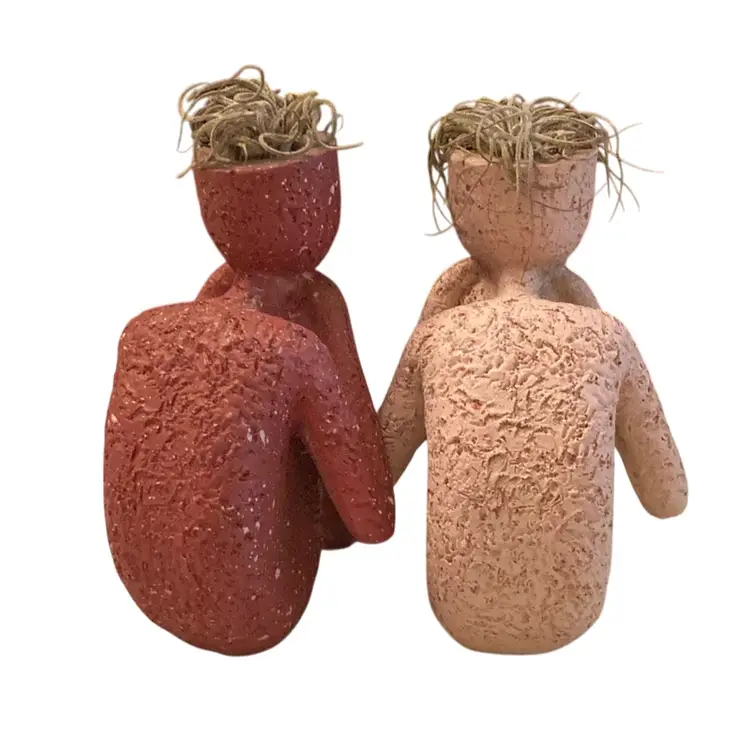 On is red and one is beige, 3.5” tall and 2” wide. Made of Resin. Hair made from dried moss.