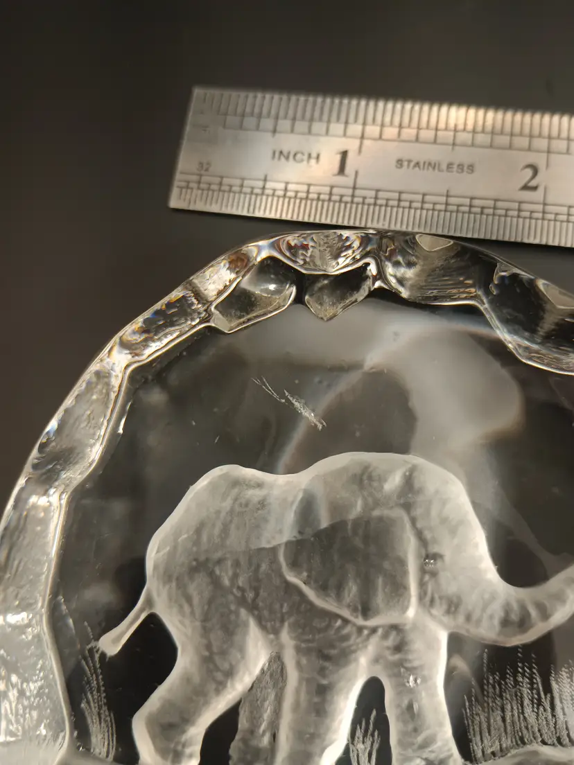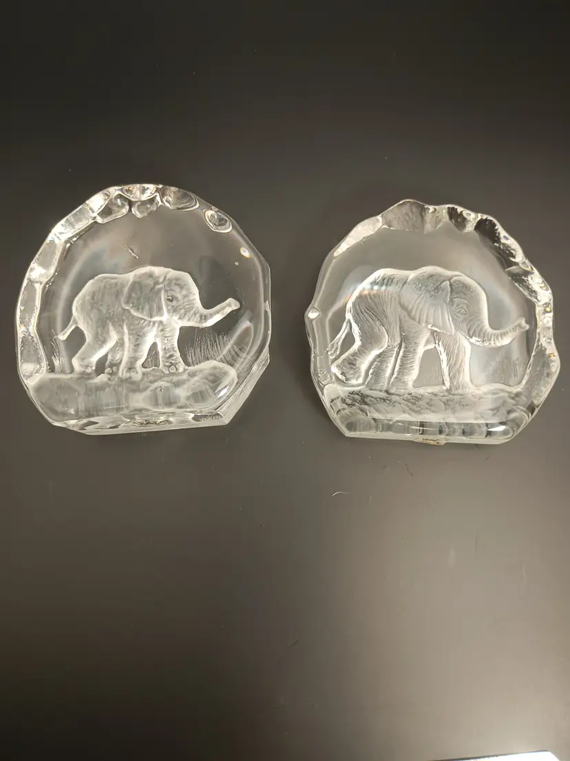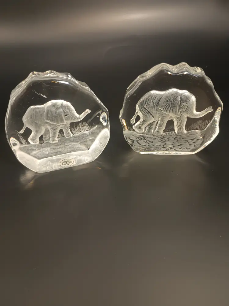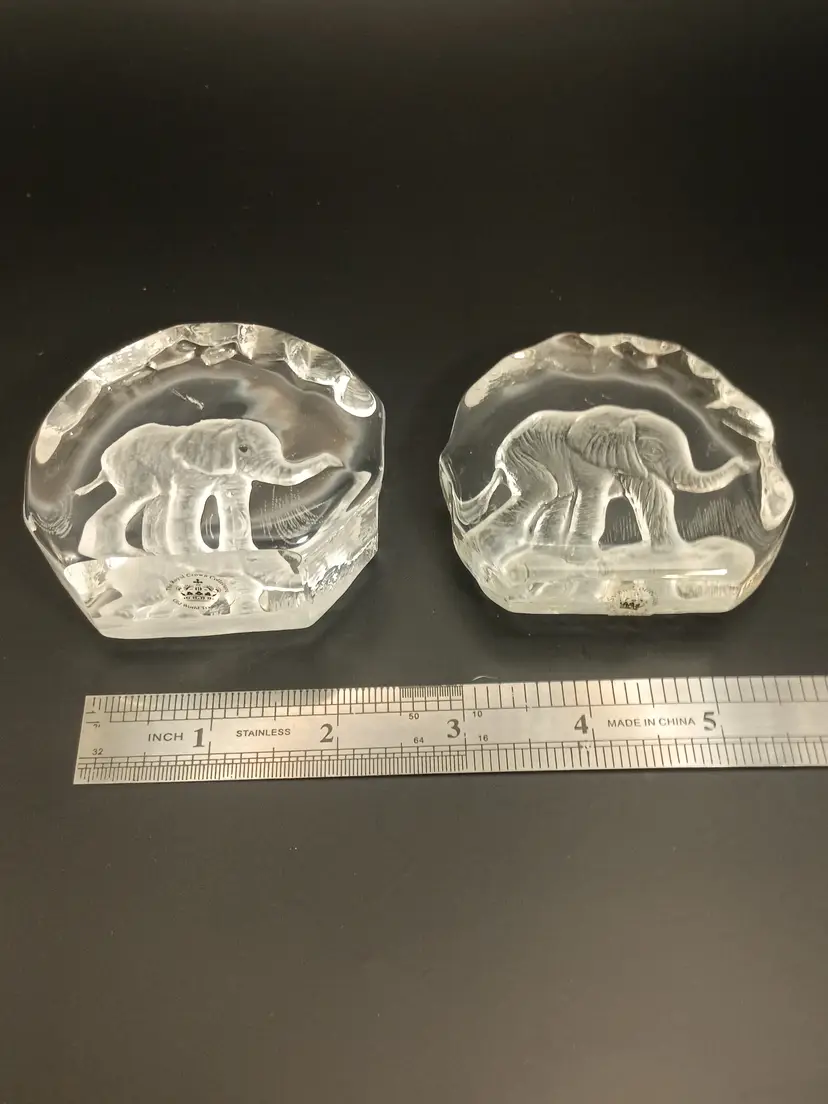 Hi, thanks for looking at this listing. You will receive 2 glass paperweights with an elephant motif. The smaller one approximately 3 inches tall, and is marked The Swan Collection, Hand Crafted on the bottom sticker. The second one approximately 3 inches tall but much thicker is marked The Royal Crown Collection, Old Word Tradition on the bottom sticker. There is one little scratch on the larger Paperweight shown in the photos. Please let me know if you have any questions.