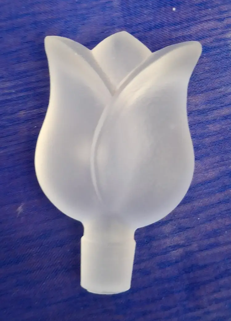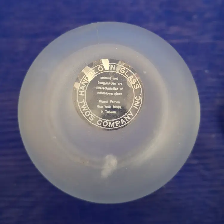 Two’s Company Hand-Blown Frosted Glass Perfume Bottle – Tulip Stopper – 4” Vintage Vanity Décor This lovely vintage perfume bottle by Two’s Company features a smooth frosted satin-glass body and a beautifully shaped tulip stopper. Hand-blown in Taiwan for the Mount Vernon, New York design house, it retains the original label noting that bubbles and slight irregularities are natural characteristics of handmade glass. Measuring 4 inches tall and 2.5 inches wide, it displays beautifully and adds a soft, elegant touch to any vanity or perfume bottle collection. Excellent condition.