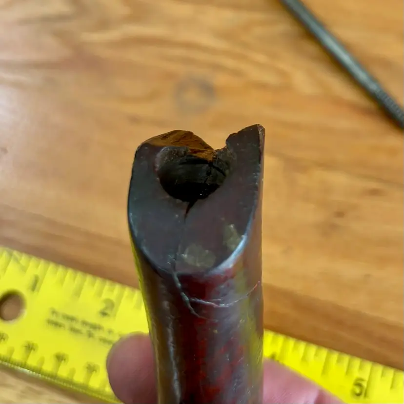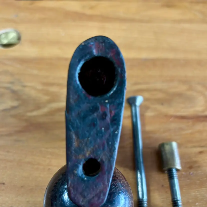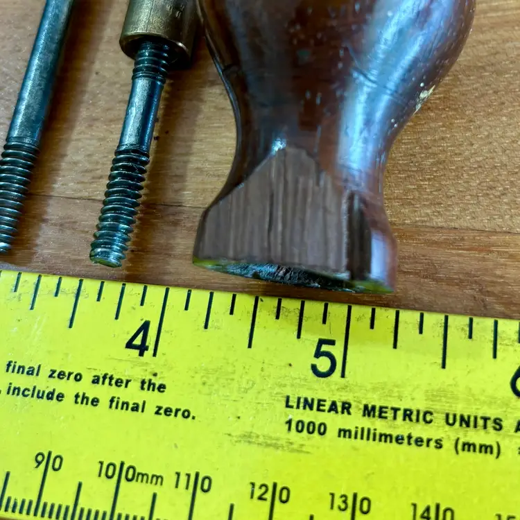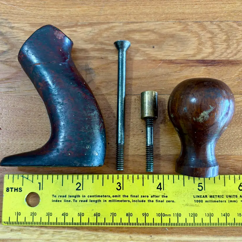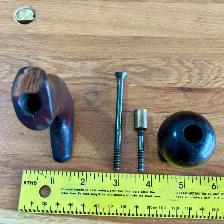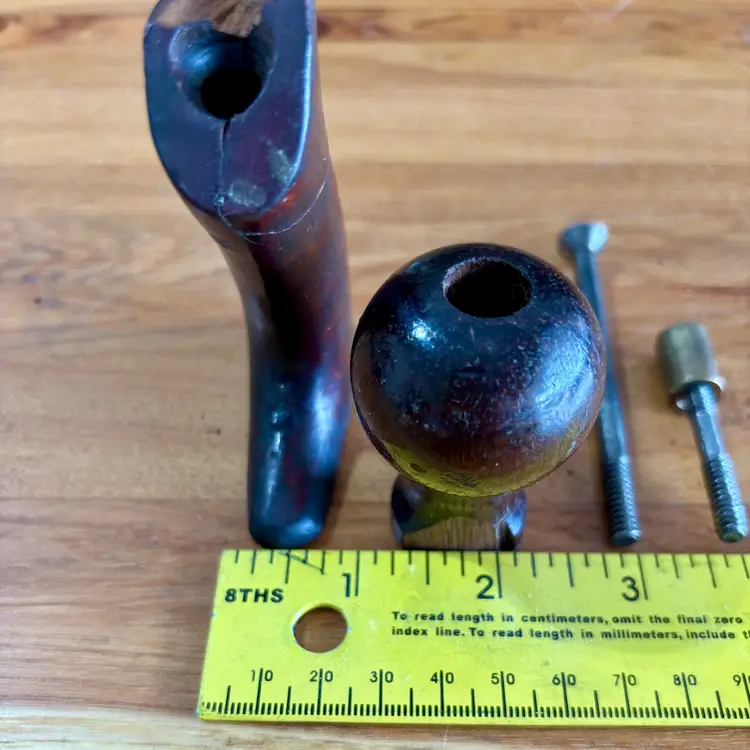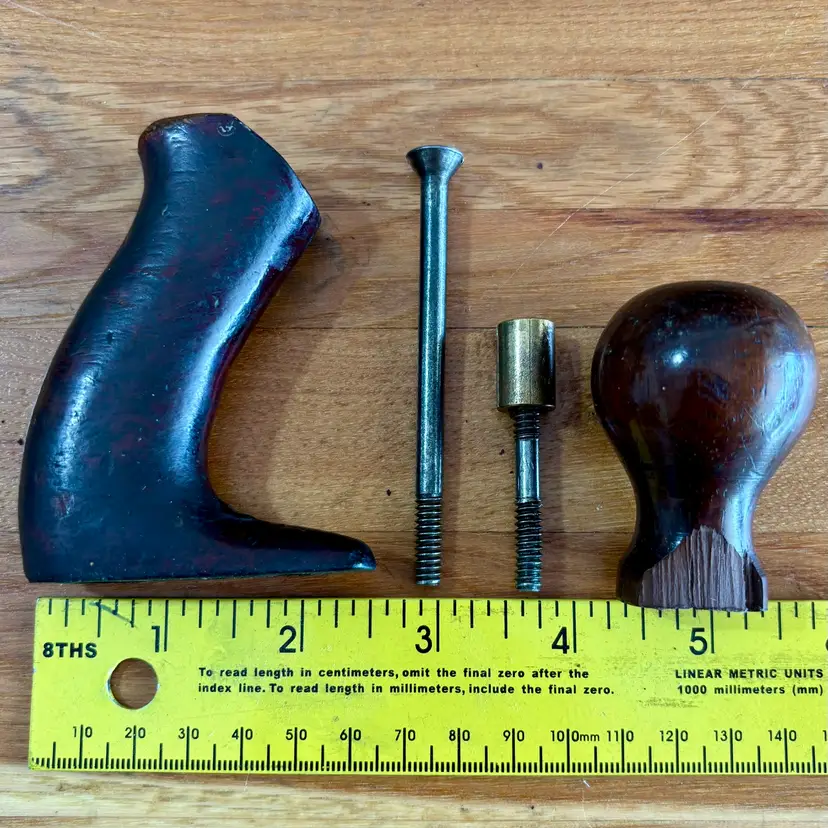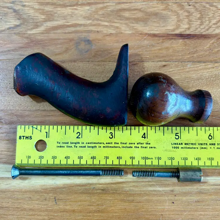 This hardwood tote and knob were found on a Union Number 2 bench plane. This listing includes the tote and mounting screw, along with the front knob, bolt, and brass barrel nut. See pictures for more detail, but the tote horn has been broken off and has a repaired break near the top. The knob has a broken section near the bottom but is in otherwise good shape. Both pieces appear to be Brazilian rosewood.
