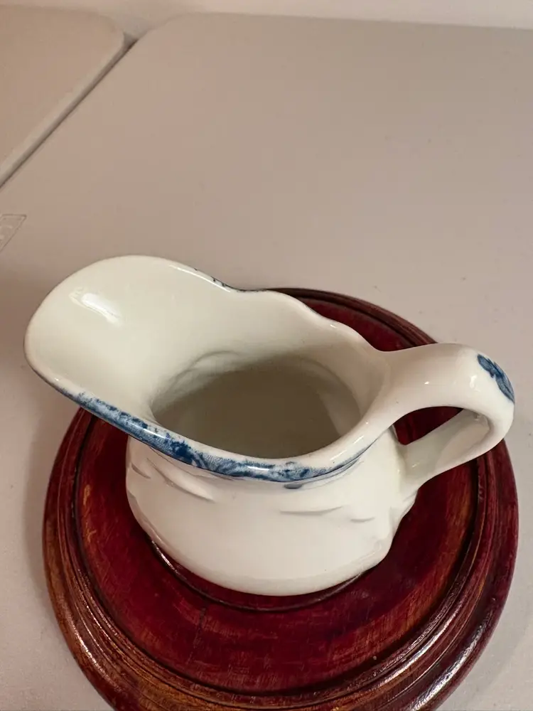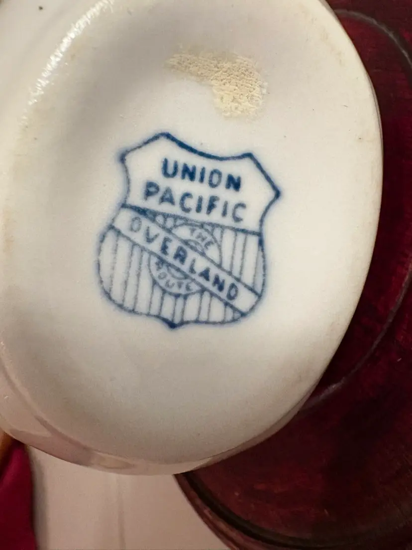 Union Pacific Railroad China: Union Pacific Railroad commissioned various china patterns for its dining cars, reflecting the luxurious services offered during the golden age of rail travel. Harriman Blue Pattern: One notable pattern was "Harriman Blue," characterized by its distinctive blue and white design, similar to the pitcher in the image. 3 1/2” tall.