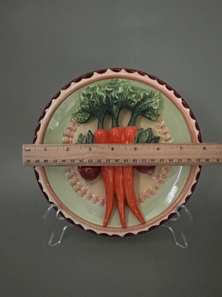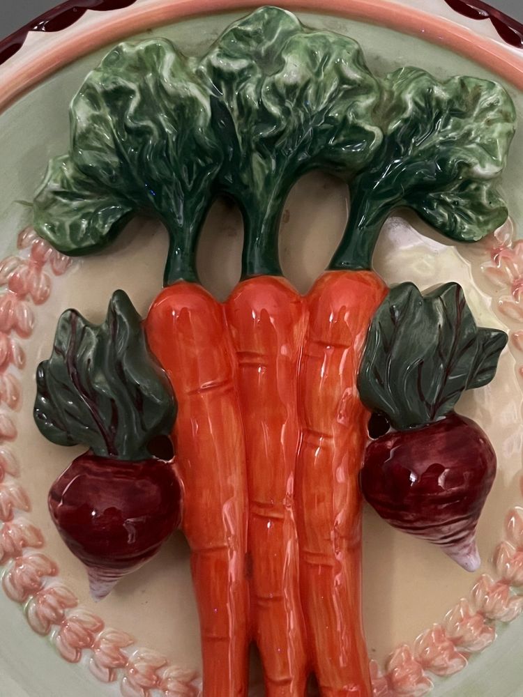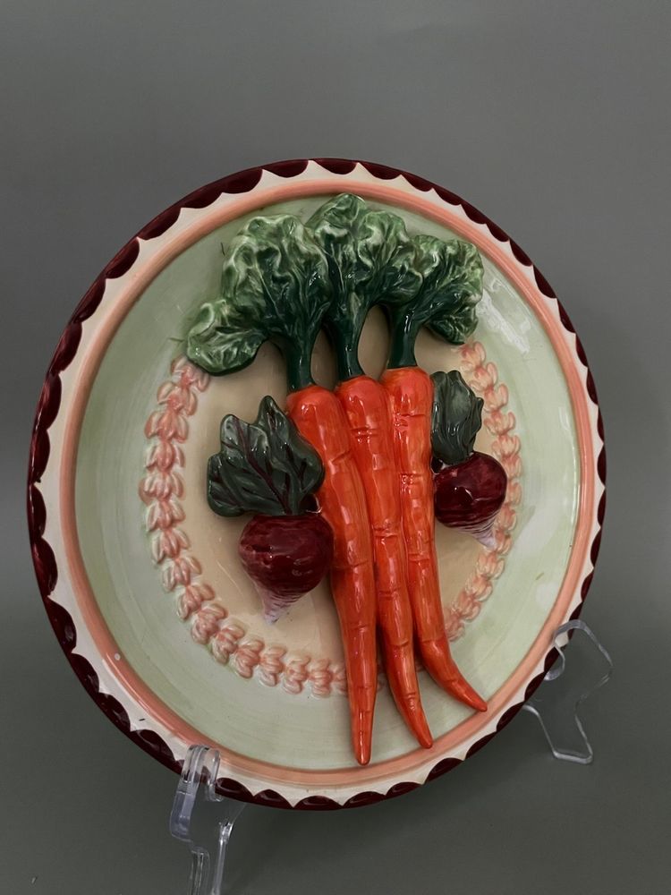 The Unique Decorative 3D Carrot Plate by Bella Casa by Ganz is a charming collector's item that adds a touch of whimsy to any decor. Bella Casa by Ganz is known for Unique 3D design Wall plates or platters with trompe l'oeil (optical illusion) effects. The hand-painted, sculpted, fruit and vegetables appear to be on the plate. These are the most distinctive of the collection.