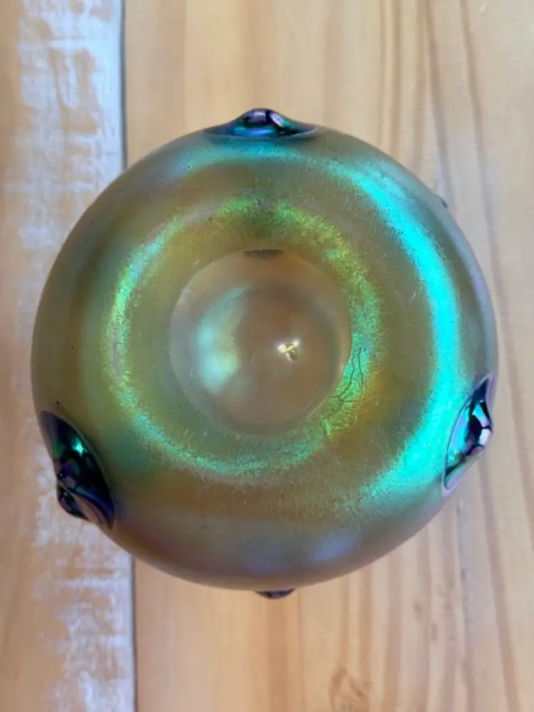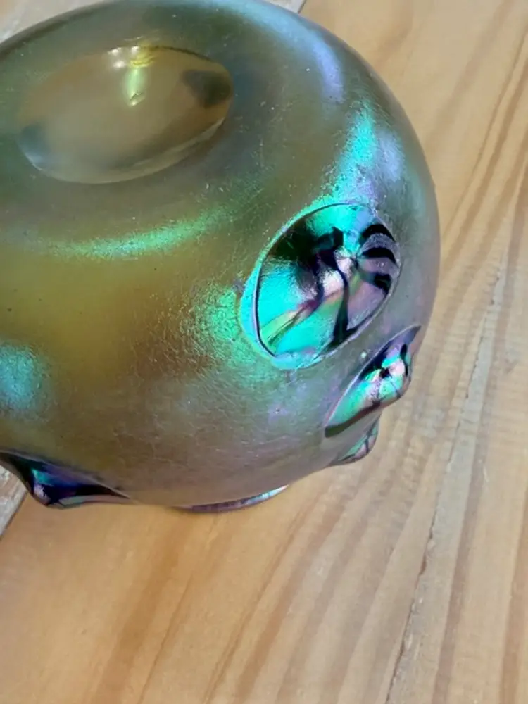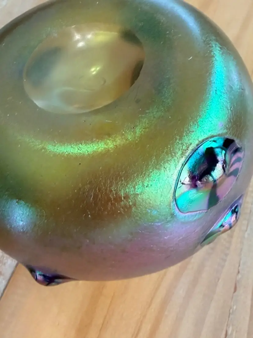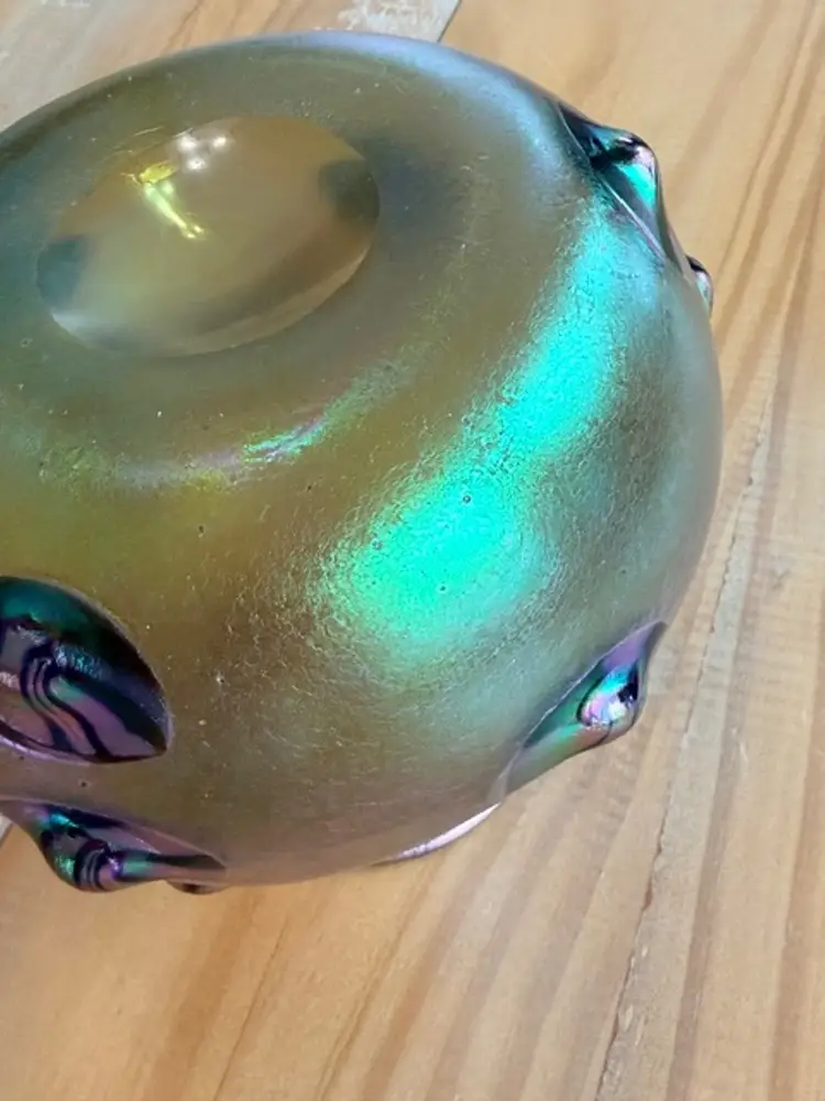This product is an unsigned Loetz Leonidas art glass vase, handblown and measuring 5.75 inches in height. The vase features an Art Nouveau style, typical of art glass production techniques. Produced with hand-blown glassmaking, this vintage vase is a beautiful and unique decorative piece for any collector or admirer of glass artistry. W: 6" H: 5.75"