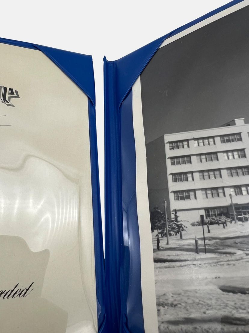 The outer blue binder has a tear along the center hinge. The letter has some darkening at the top. See pictures for further details on condition.