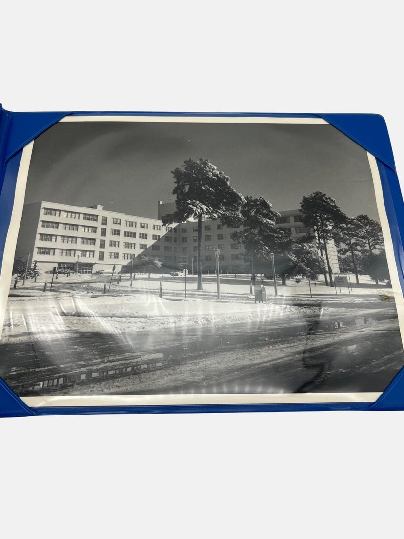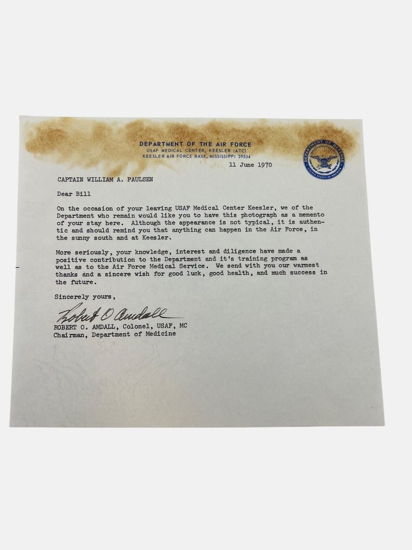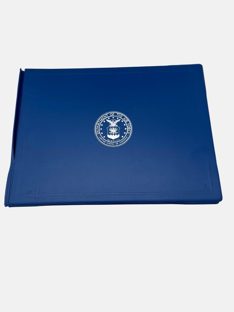 This United State Air Force collection of military items includes an honorable discharge certificate dated 1972, a letter from 1970 related to leaving a job at USAF Medical Center Keesler, and a photograph of Keesler Medical Center, all housed in a blue binder with the USAF logo on the front.