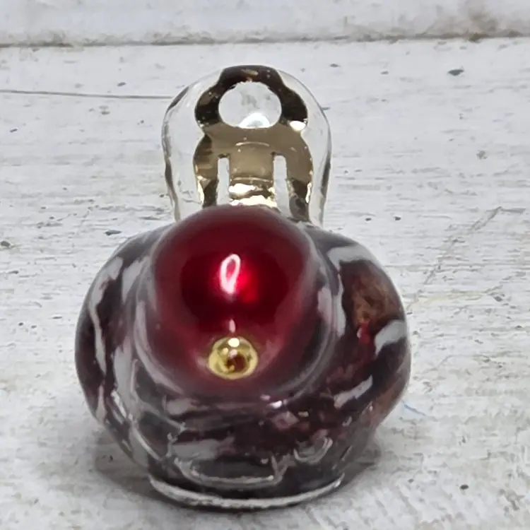 She has a gold seed bead beak. The small wine red beads I used one for the head. The center bead from the necklace reminds me of a rose and it went into the body. The tail is made from the back of a clip-on earring.