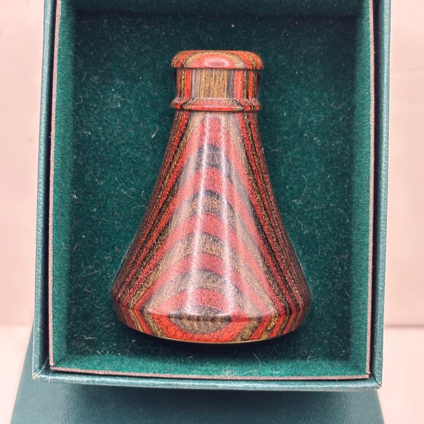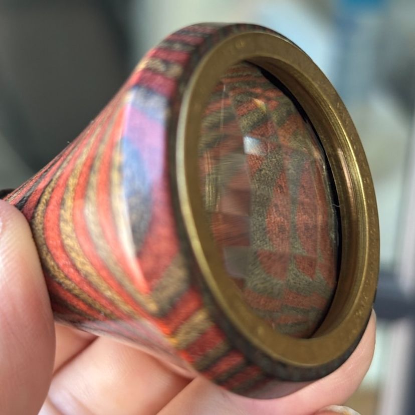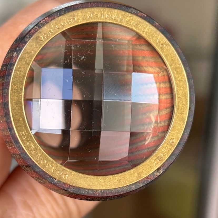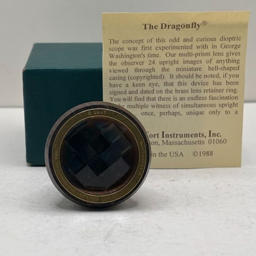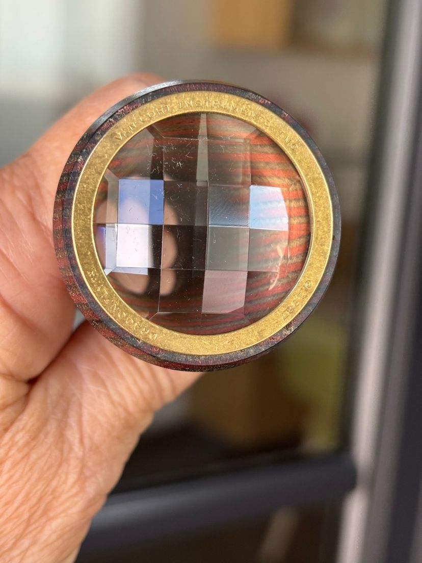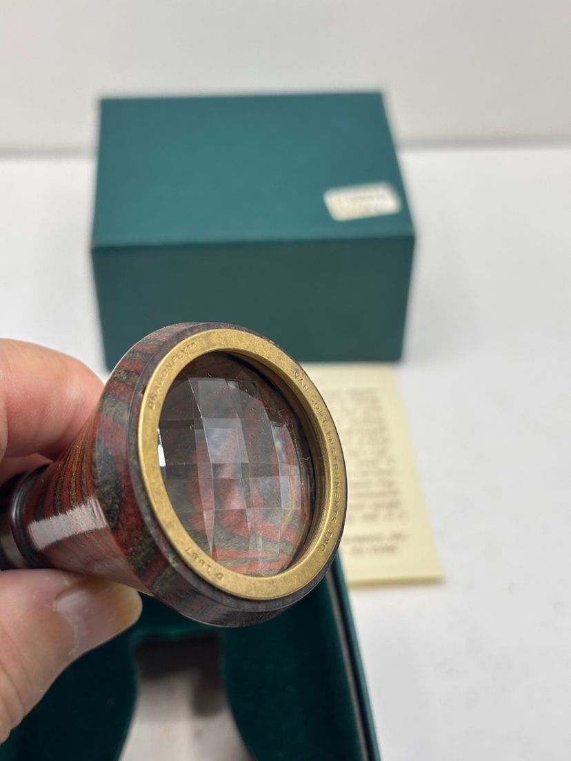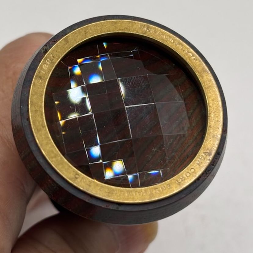 Multi-prism lens made of wood, brass and glass. The brass lens is signed and dated. Original box and information paper. A cool gift for Christmas! 2.25” tall Made in 1988.