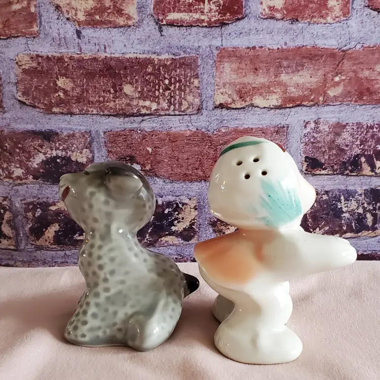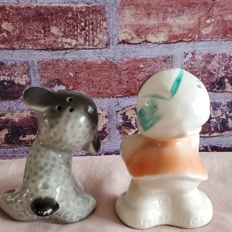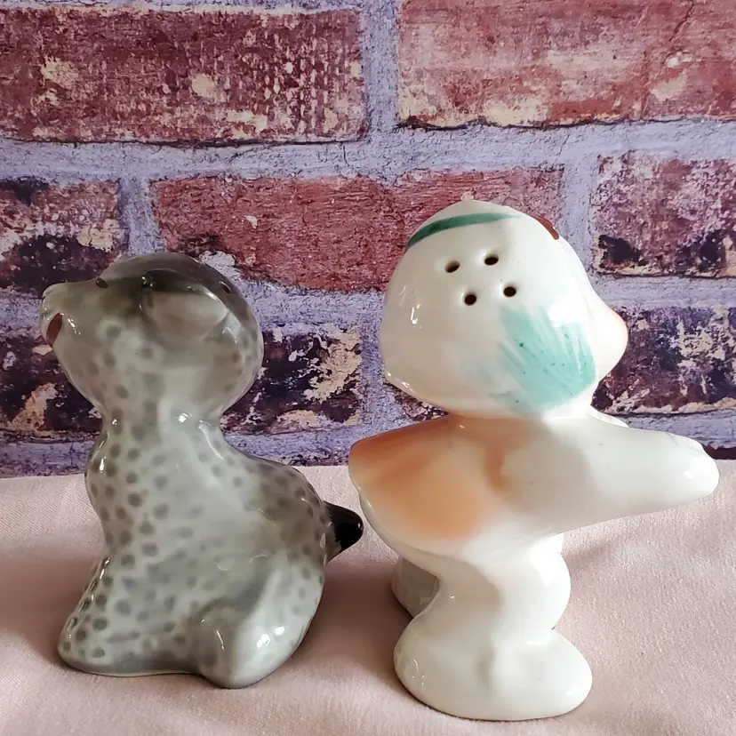 Van Tellingen (40s-50s) "Mary Had a Little Lamb" ceramic salt and pepper shakers. GUC-Mary is missing her cork, but very good condition otherwise. Cute little shaker set!