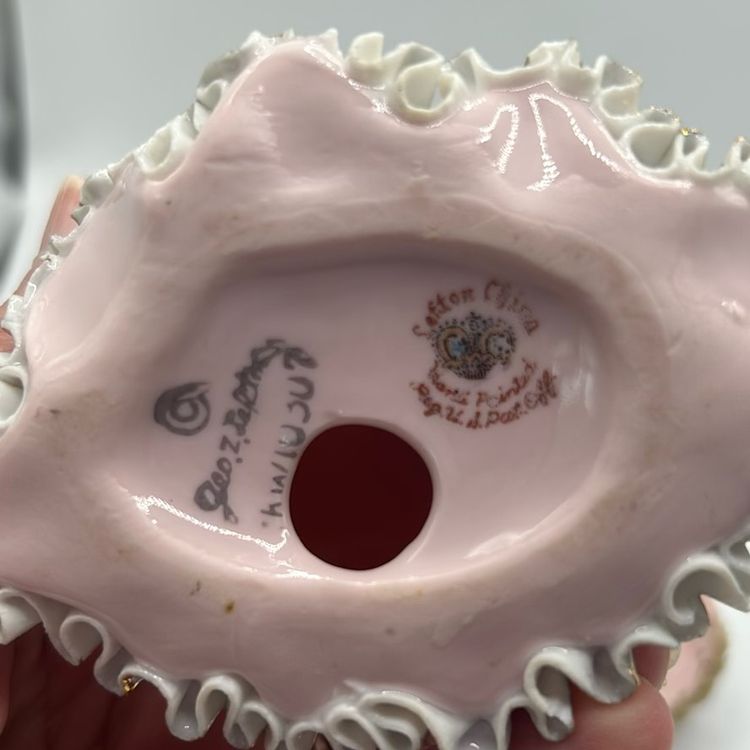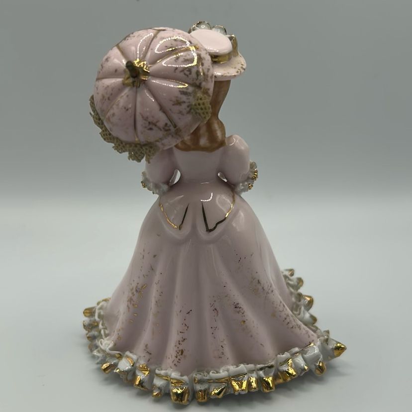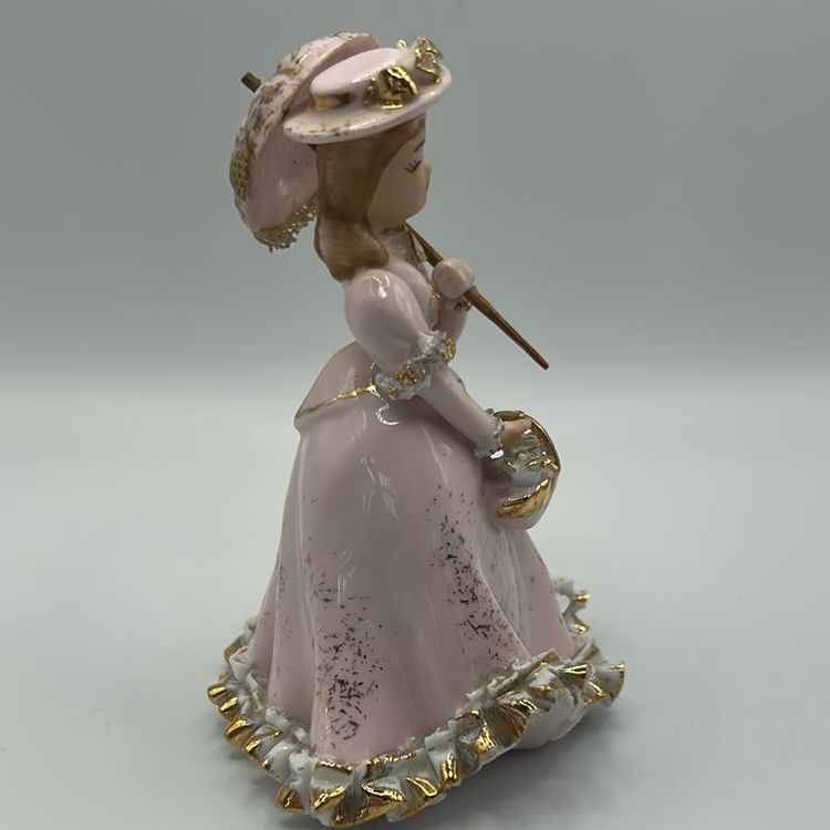 This piece is a vintage left and figurine of a girl and a pink dress carrying an umbrella and a basket of flowers. It is model KW10307. Is attributed to the designer Geo Z left in. It stands approximately 4 inches tall and 4 inches across the base. As you can see in the pictures some of the embellishment is missing from the umbrella that is it’s only flaw.