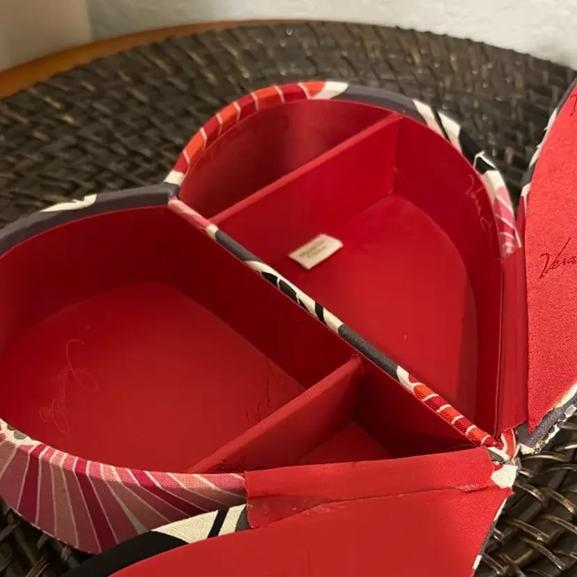 This is a Vera Bradley 'Heart to Heart' jewelry case in the 'Cheery Blossoms' pattern