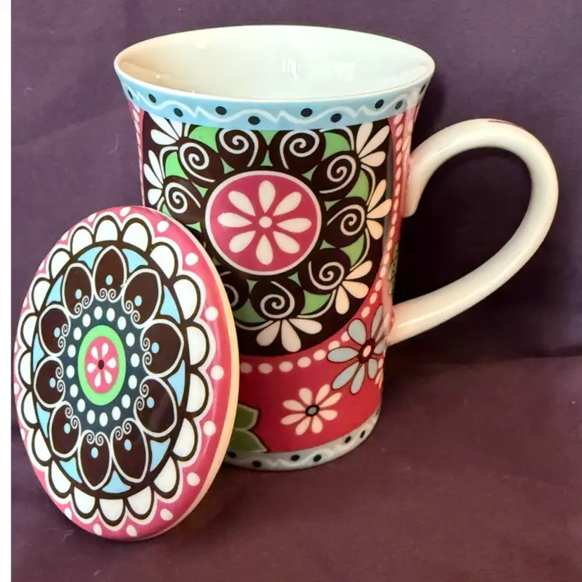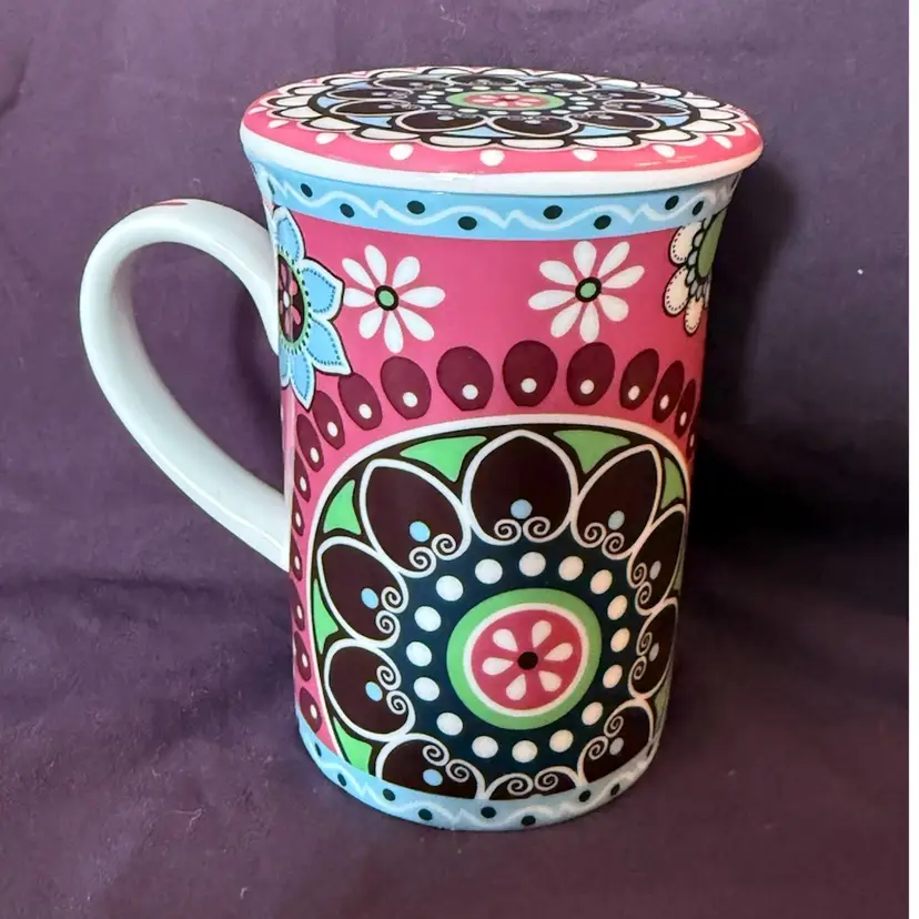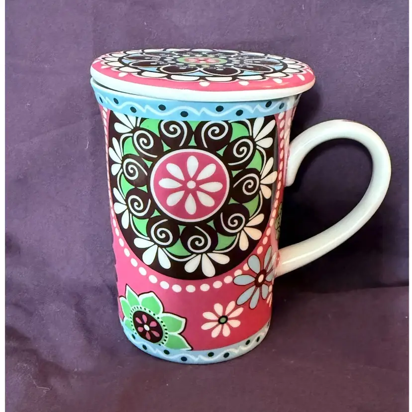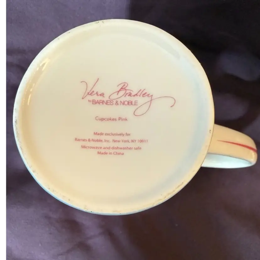 Vera Bradley “Cupcakes Pink” 8 oz mug with lid. Beautiful design with vibrant colors. 4” H x 2.5W” (4.25 W with handle) No chips or cracks.