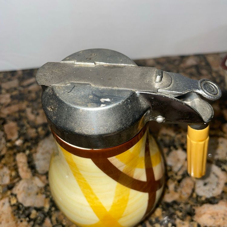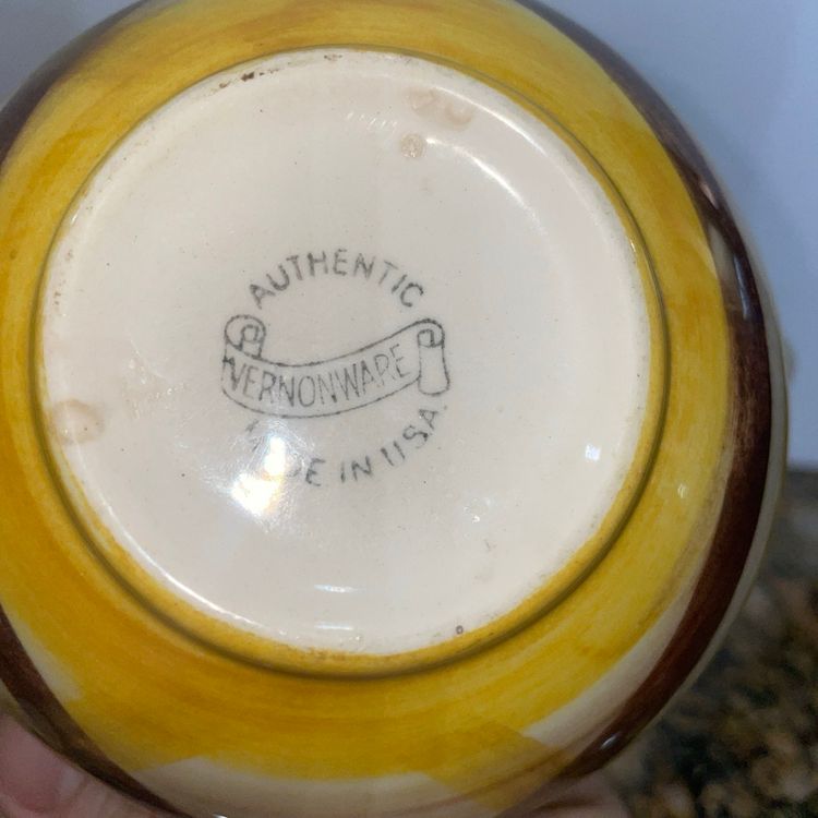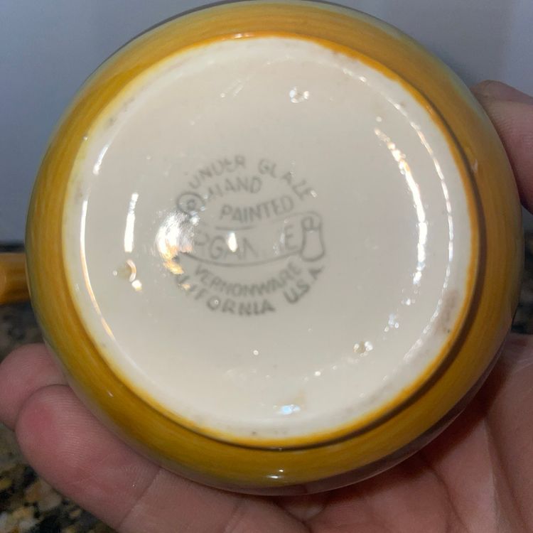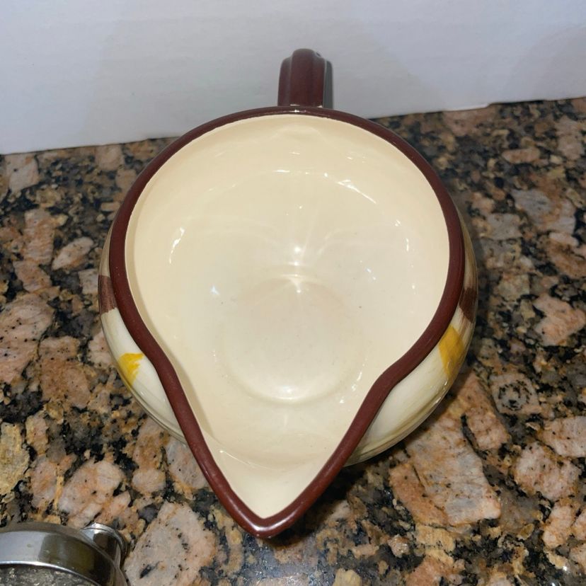 The set is perfect for serving syrup and gravy, and the pitcher has a spout for easy pouring. The set is in excellent condition, with no damage or wear. This set is a must-have for any Vernon Kilns or vintage pottery collector.