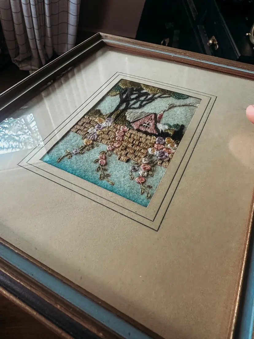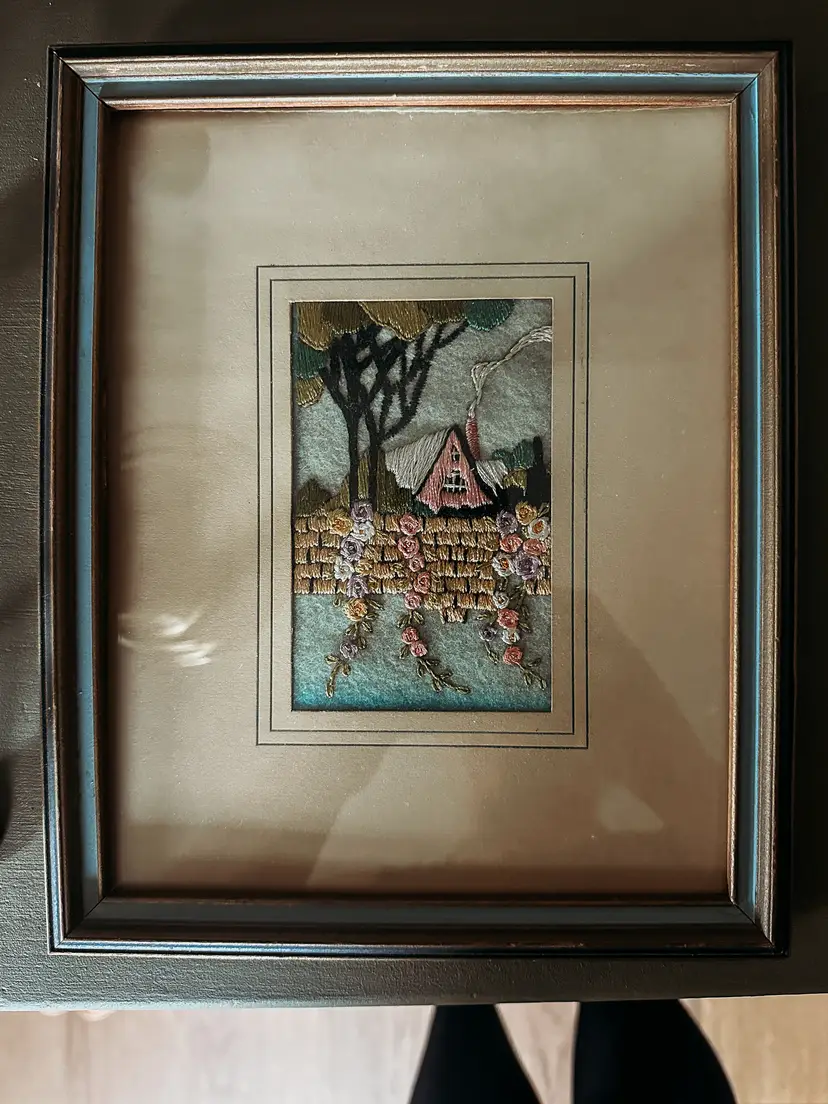 This little cottage style crewel is gorgeous! It portrays a little cottage in the background with a stone wall with cascading flowers. Gorgeous blue tones are matched by the strip on the mat. It is held together with nails indicating it was made before the 40's but I never opened it up to find a signature or date. Two nails are missing on the back so it will need a little love to keep the art secure.