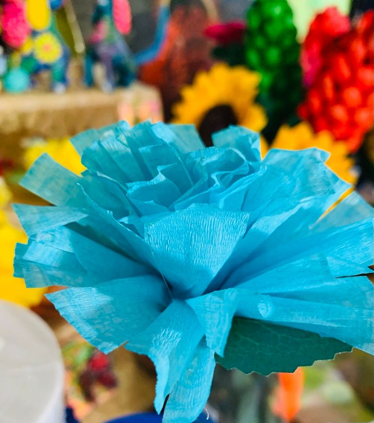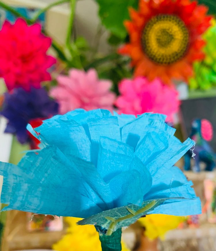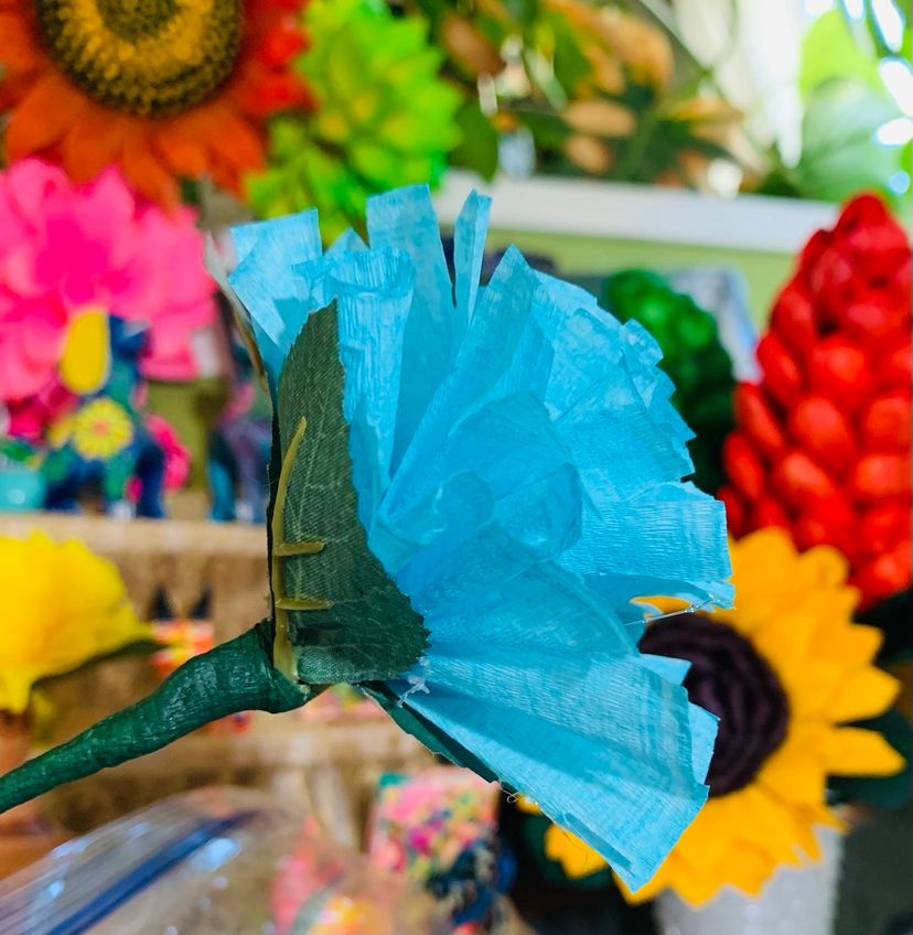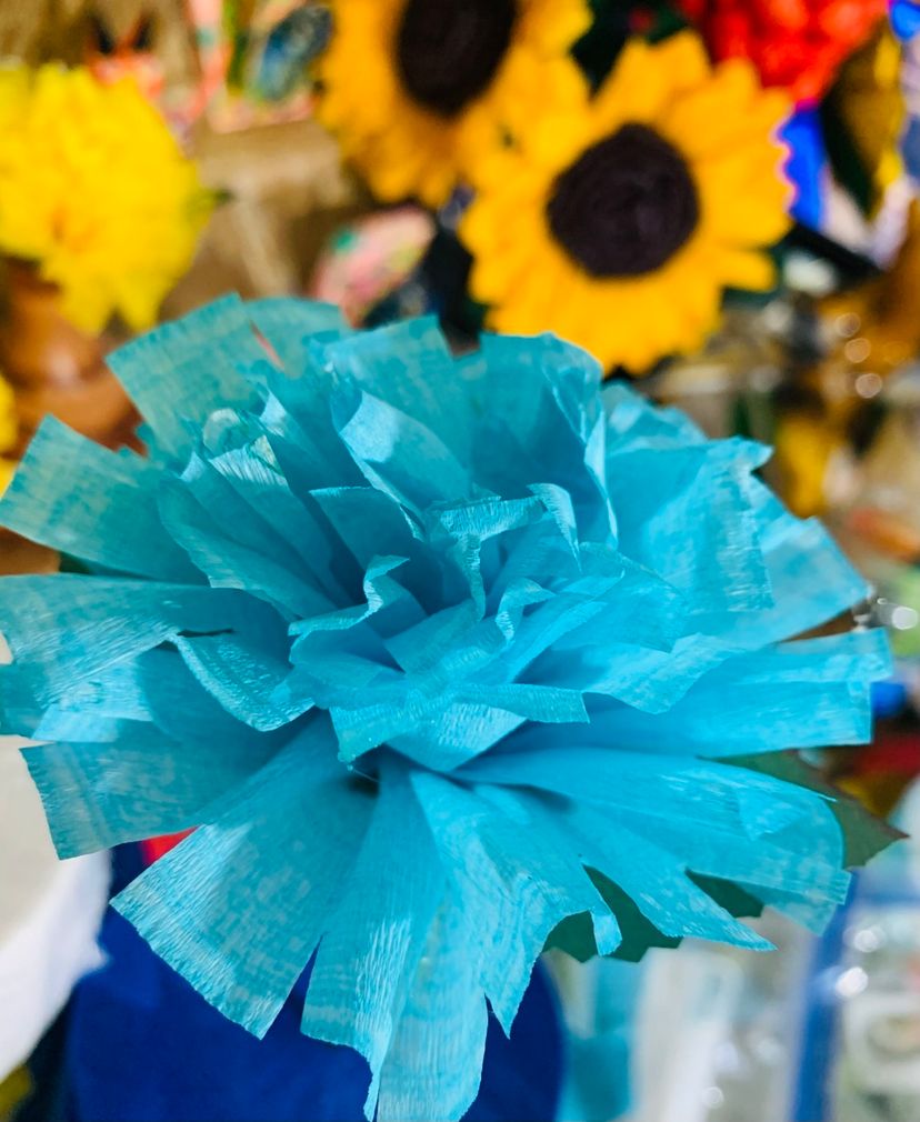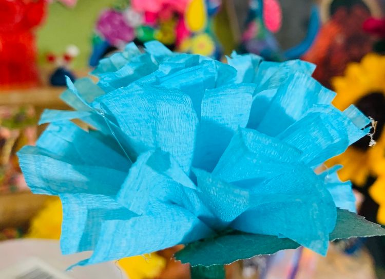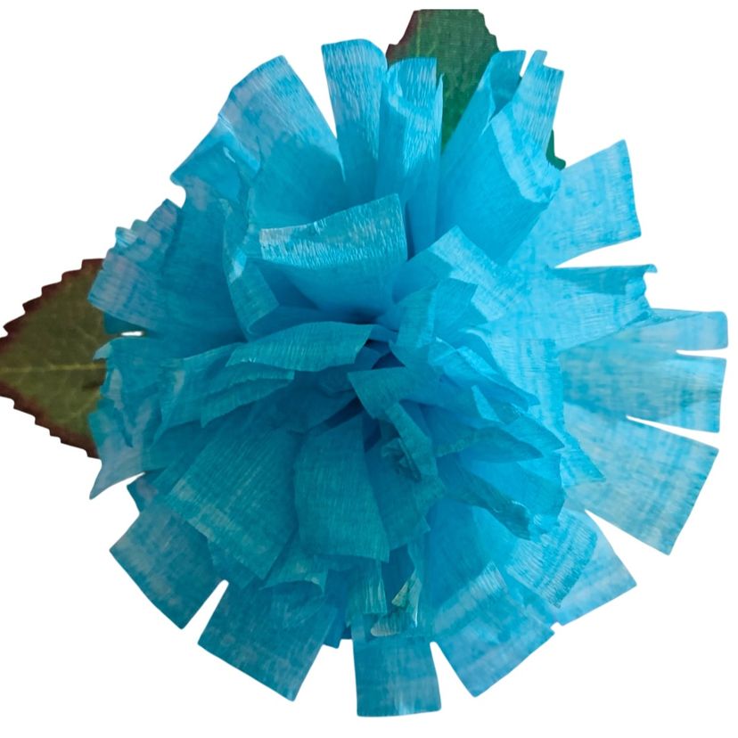 Vibrant Crepe Paper Flowers Made By Me Turquoise Blue Color Marigold Carnation Blossom 3.5-4” Diameter Blossom And 5.5-6” Tall Overall