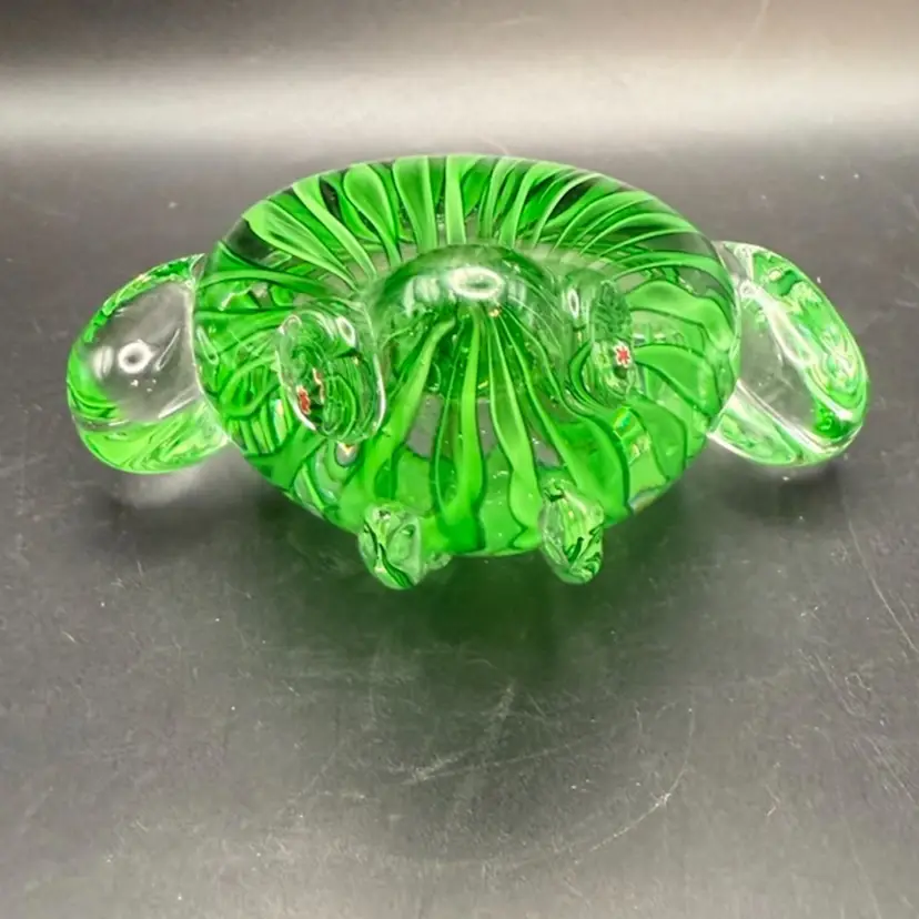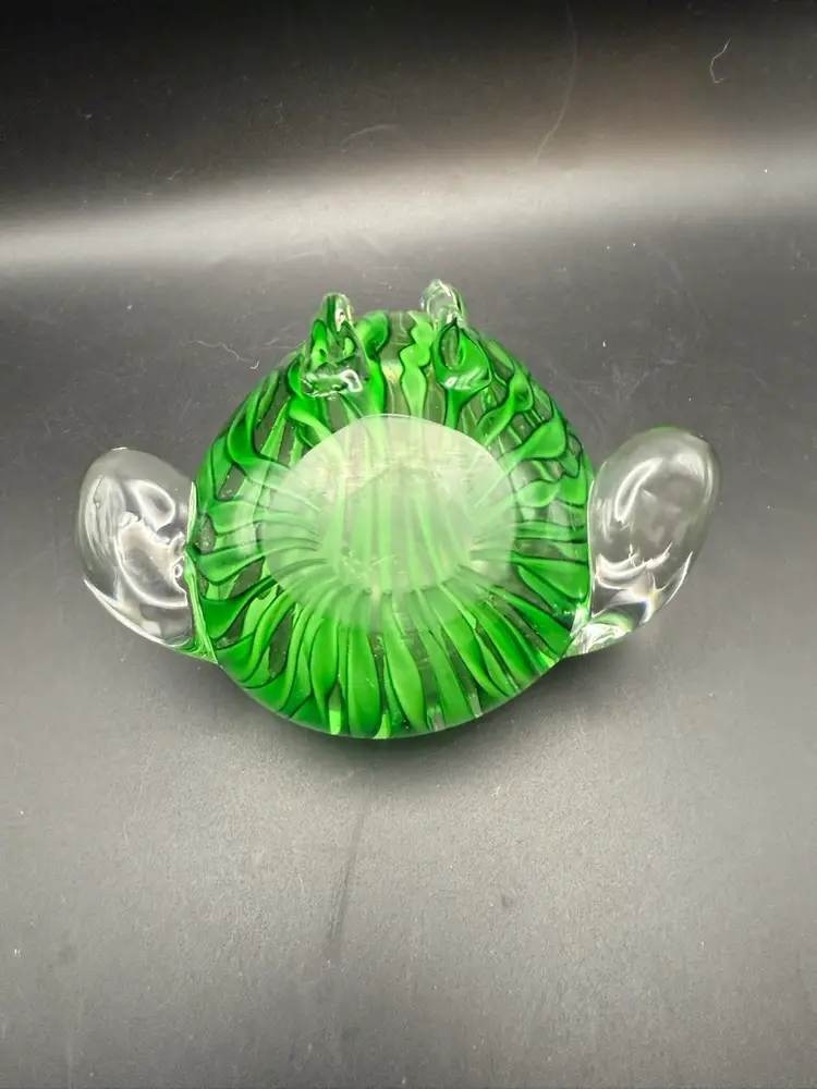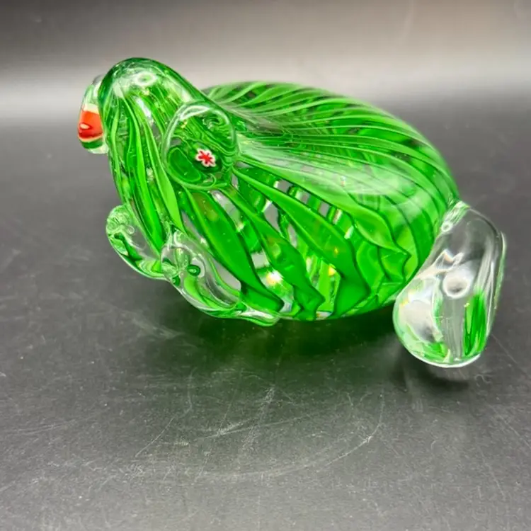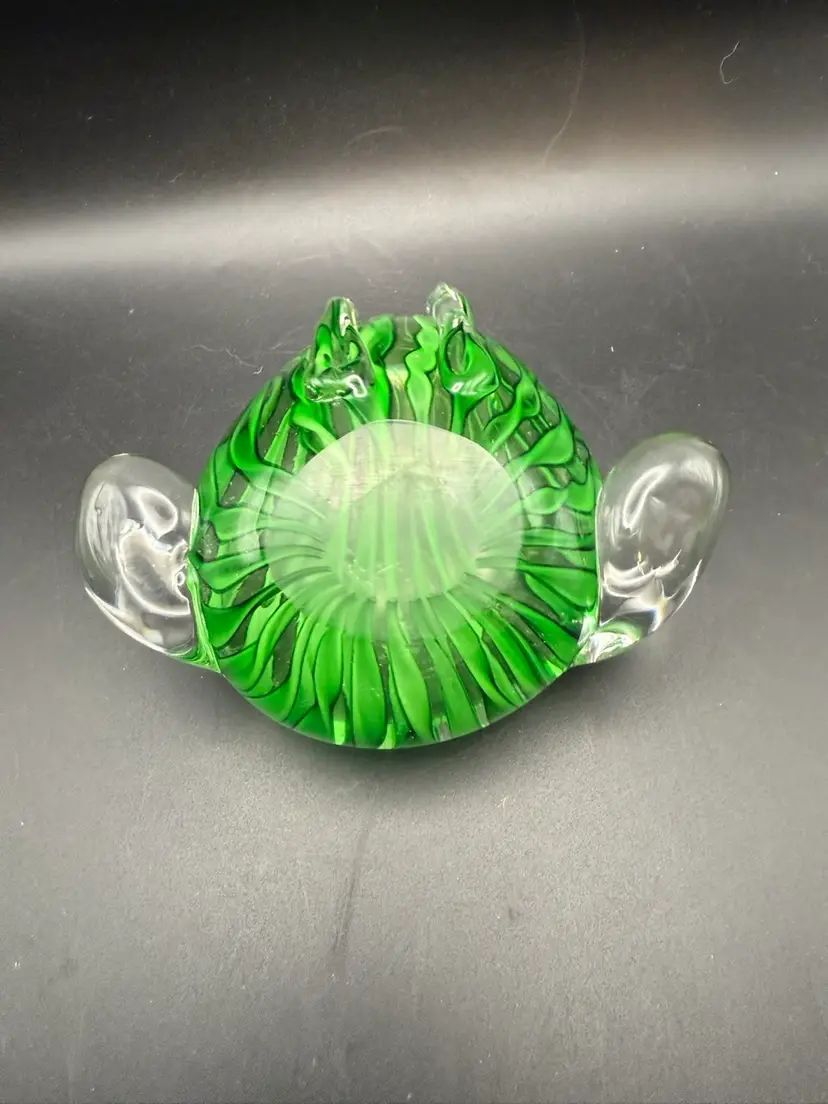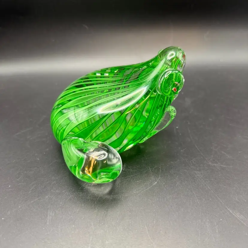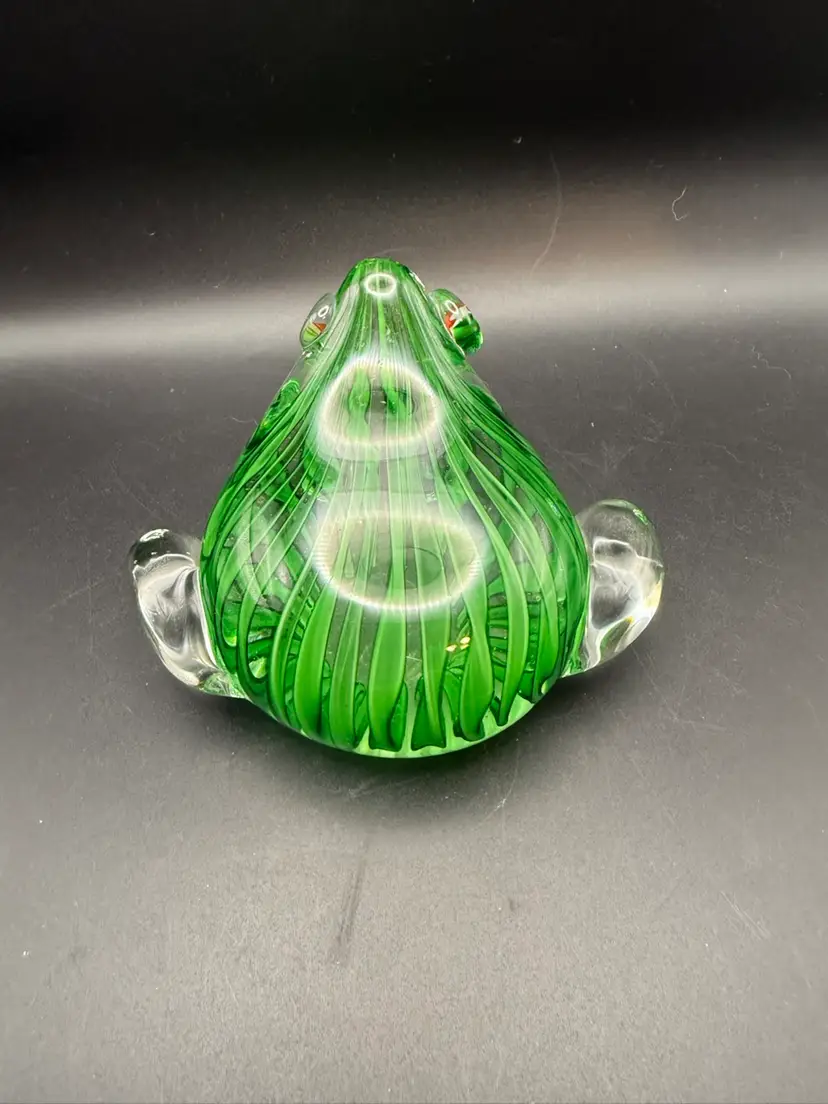 This is a beautiful glass frog with vibrant ribbons of green and cute eyes. He is 4in long and 5 in wide.