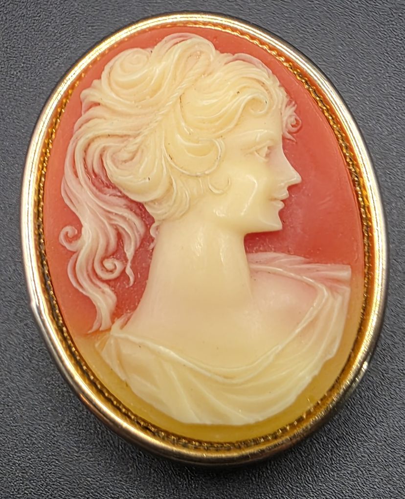 Step into a world of timeless grace with this exquisite vintage-style locket, featuring a delicately hand-carved cameo portrait of a classical woman. Her serene profile—framed by flowing curls and a draped gown—is rendered in soft ivory relief against a warm coral-red background, capturing the romantic artistry of the Victorian era. The oval frame is finished in a gold-tone beaded border, adding a touch of antique refinement.