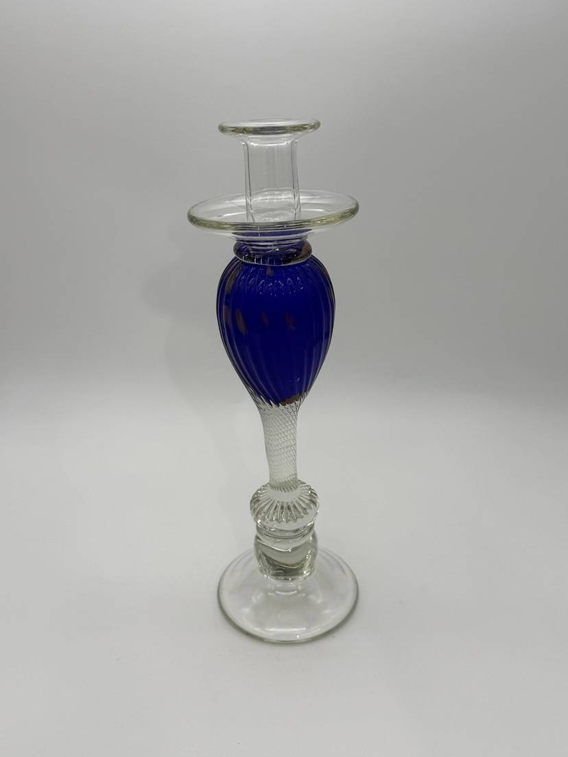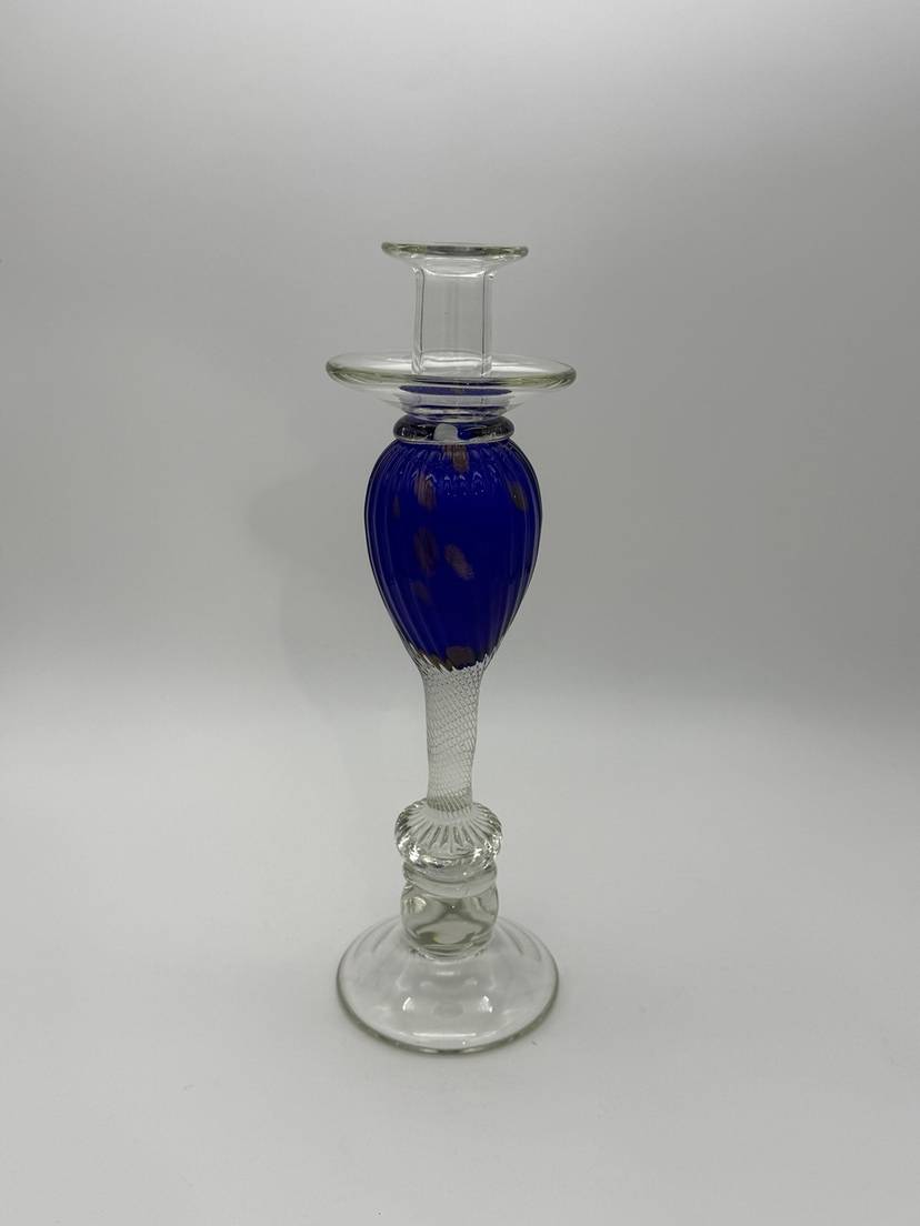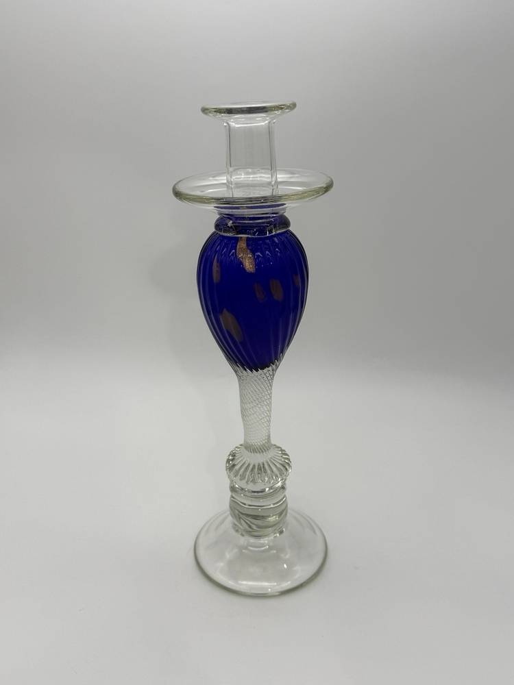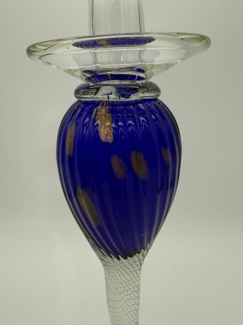 The Vincenzo Nason Murano Handblown Art Glass Candlestick Holder in Blue Aventurine is a stunning piece of furniture decor that adds a touch of elegance to any room. This 13-inch candle holder features a beautiful blue aventurine pattern with gold glitter accents, making it suitable for all occasions. Handmade in Italy using a hand-blown glass production technique, this unique candle holder is designed for easy care and is sure to be a standout piece in any collection.
