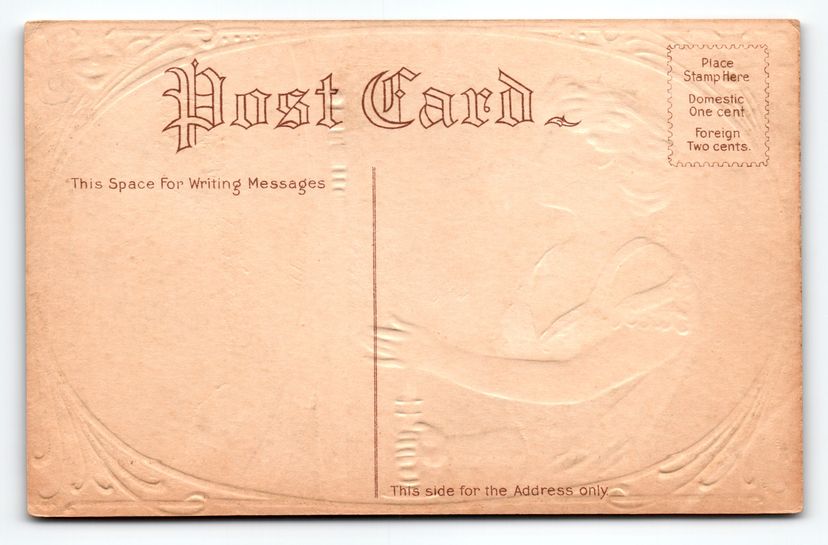 The inscription "ALL HALLOW-E'EN" and a poetic message, "The reflection which you see is the counterfeit of me," contribute to the postcard's mysterious and nostalgic Halloween theme. The back of the card is divided, typical of the 1907-1915 period, with space for writing messages and a section for the address, marked for domestic and foreign postage rates. This postcard is a rare find for collectors interested in early 20th-century holiday ephemera, lithographic printing techniques, and embossed paper collectibles.