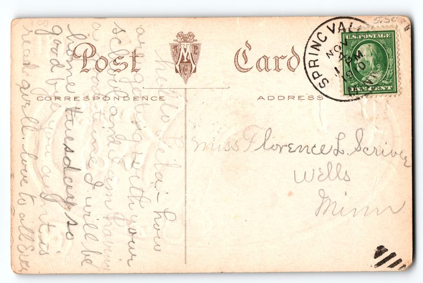 Measuring the standard 5.5 x 3.5 inches, this original paper postcard showcases vibrant colors and intricate detailing, including the flame of a melting candle that blends into the woman's flowing scarf, creating a mystical effect. The back of the postcard features handwriting and an early 1-cent green U.S. postage stamp postmarked from Spring Valley, indicating it was mailed in the historic period. This collectible item is ideal for Halloween enthusiasts, vintage postcard collectors, or those intrigued by nostalgic holiday ephemera.