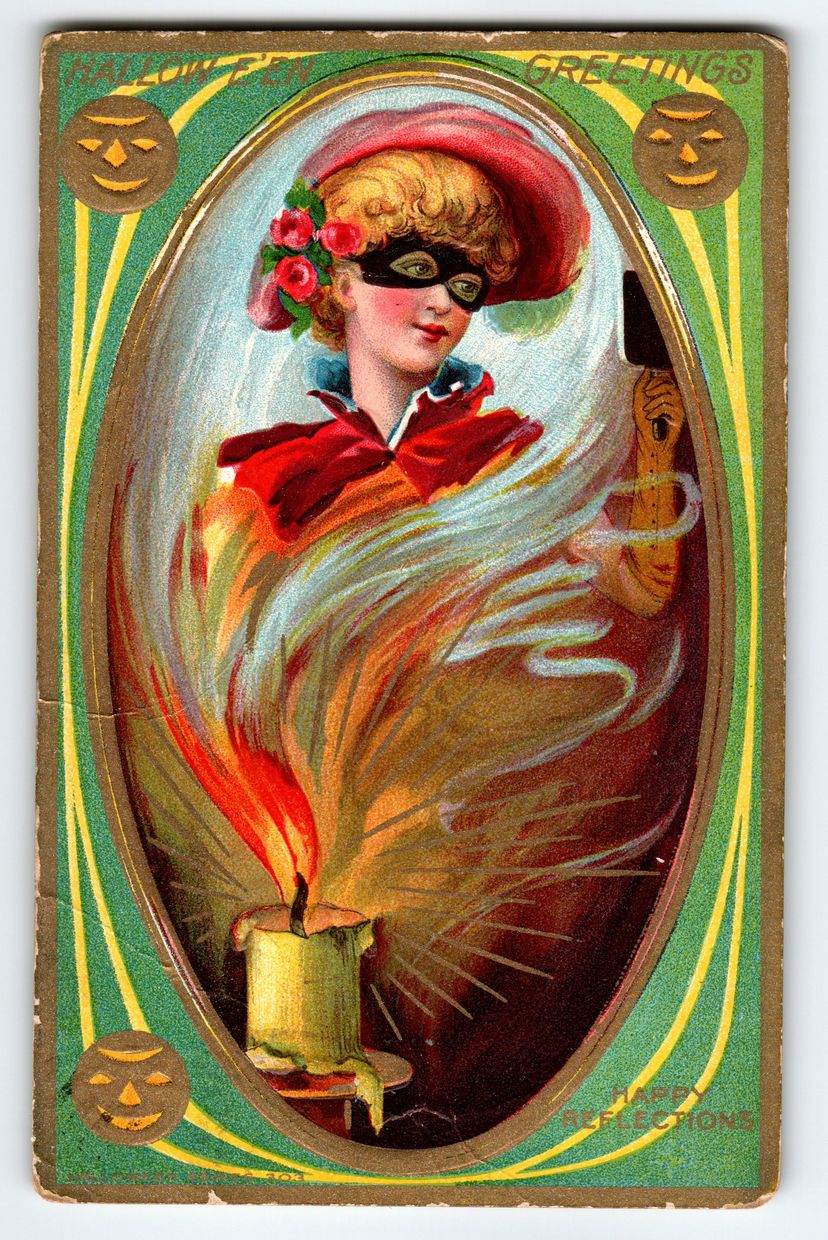This charming vintage Halloween postcard from the early 1900s features a beautifully illustrated masked woman in a red hat adorned with roses, holding a hand mirror. The image is framed by an oval border with smiling jack-o'-lantern faces and the words "Halloween Greetings" at the top, along with "Happy Reflections" at the bottom right. Printed using lithograph techniques typical of the divided back era (1907-1915), this postcard captures the whimsical and festive spirit of early 20th-century Halloween celebrations.
