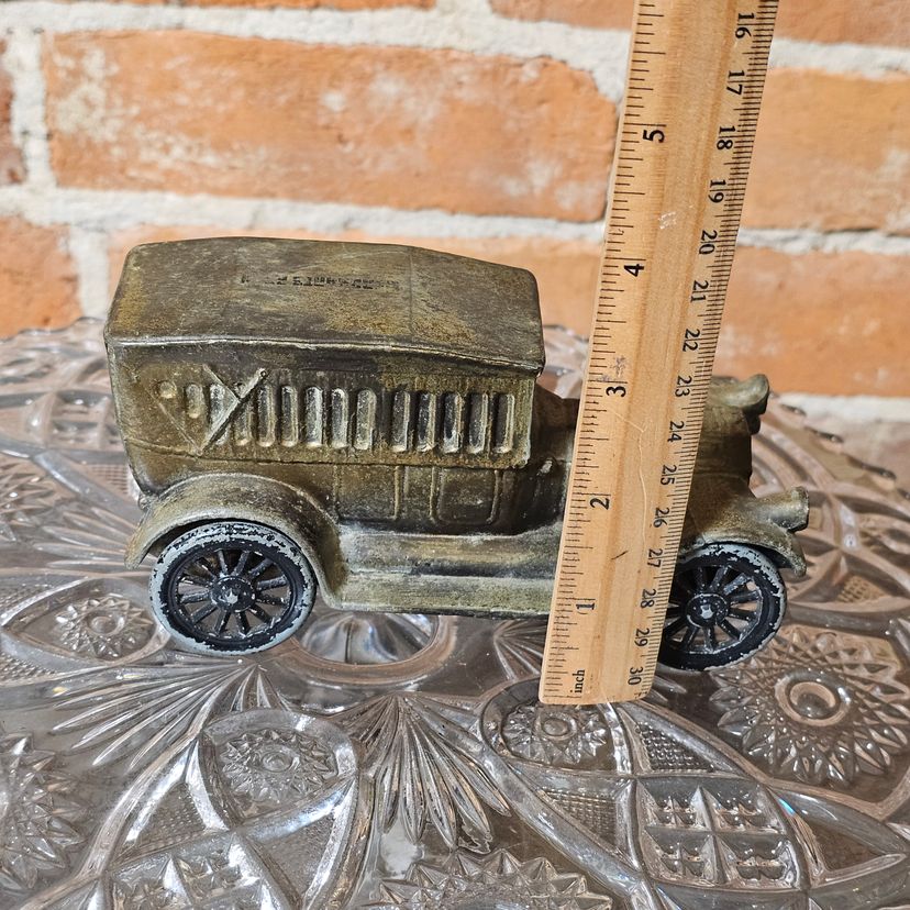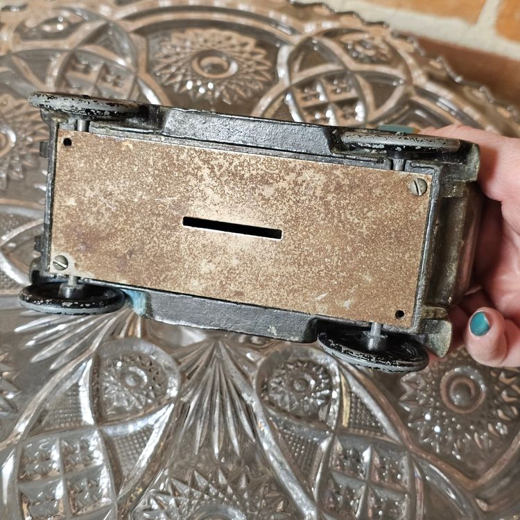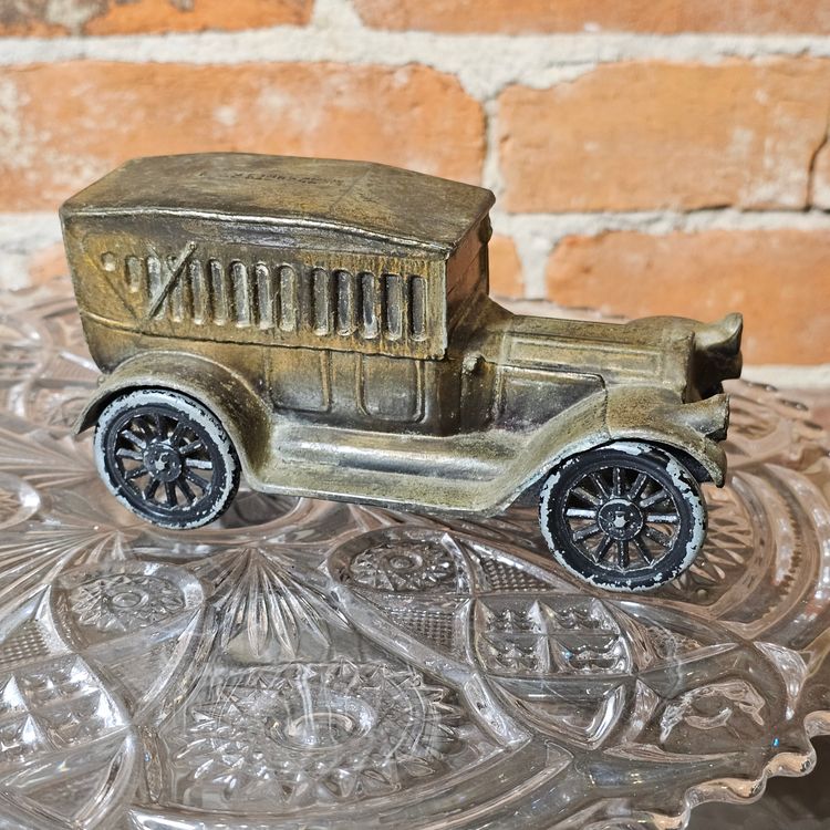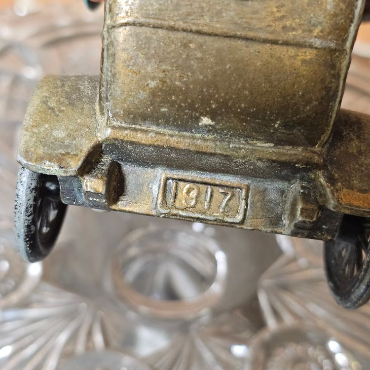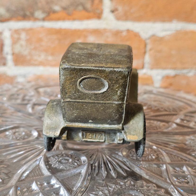This is a charming antique diecast metal replica of a classic 1917 automobile (possibly a Model T or similar style of the era). This piece functions as a coin bank and is a great collector's item for automotive enthusiasts.