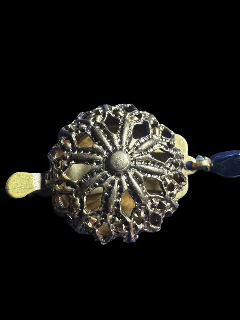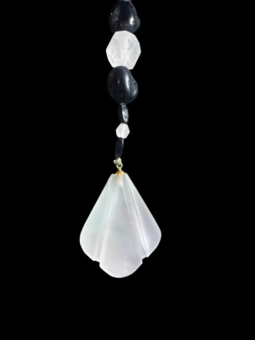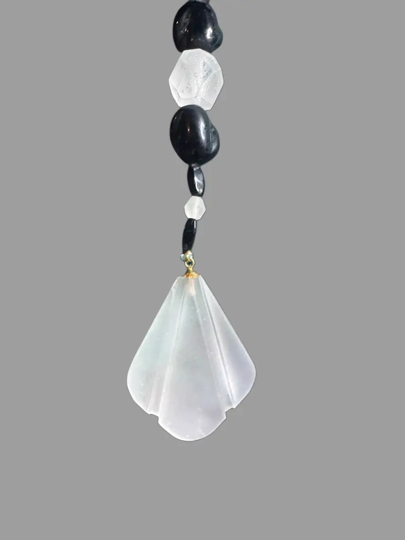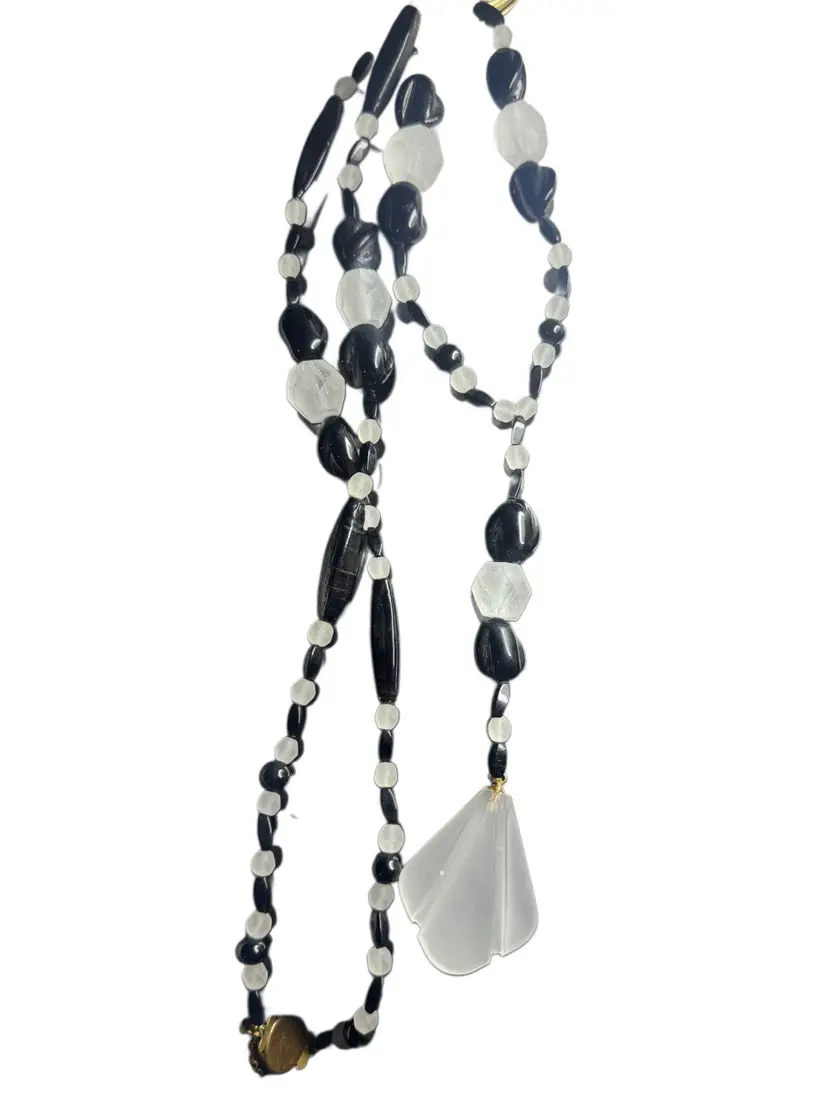 This vintage necklace is a classic flapper Art Deco look! It’s rather long, hanging 22 inches when worn! the beautiful matte glass feature stone is almost 1 3/4 inches long by itself, and hangs with several other black-and-white stones as a drop from the main necklace! what I am saying is this beauty is a beast! French jet black stones are offset with beautiful faceted crystal clear art glass stones and matte glass stones. Even the clasp on this peice is beautiful!