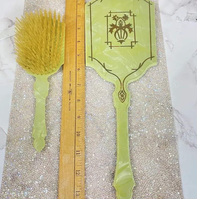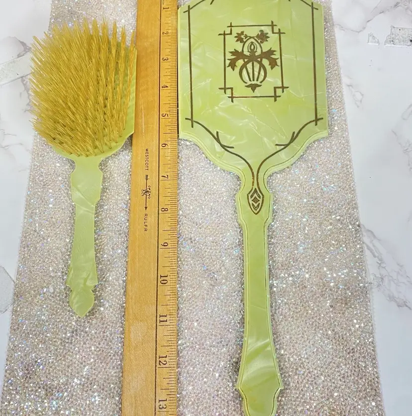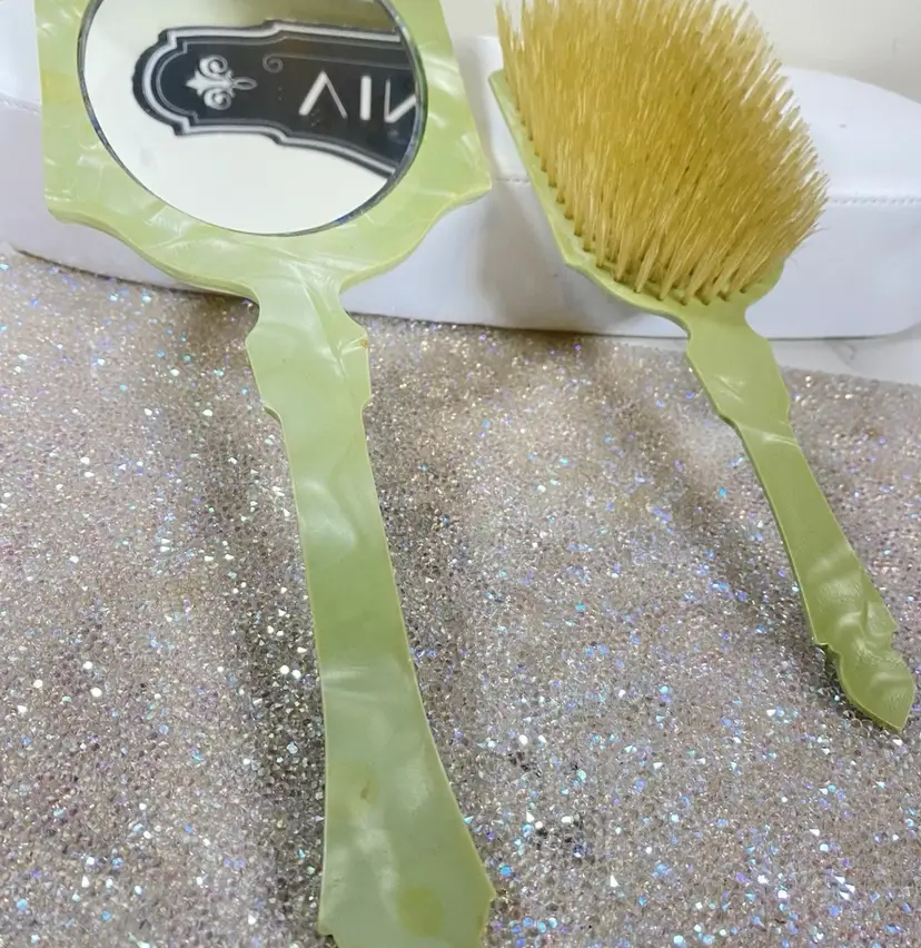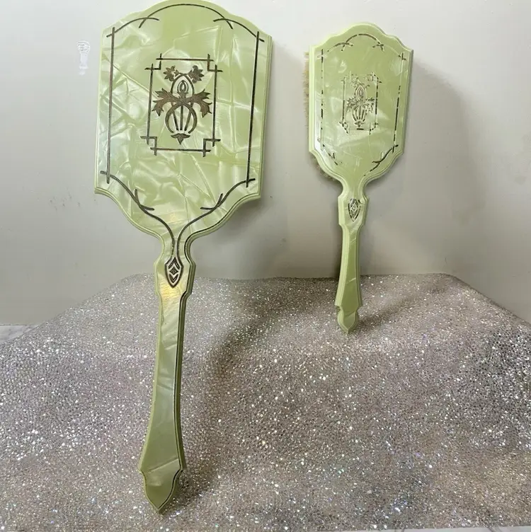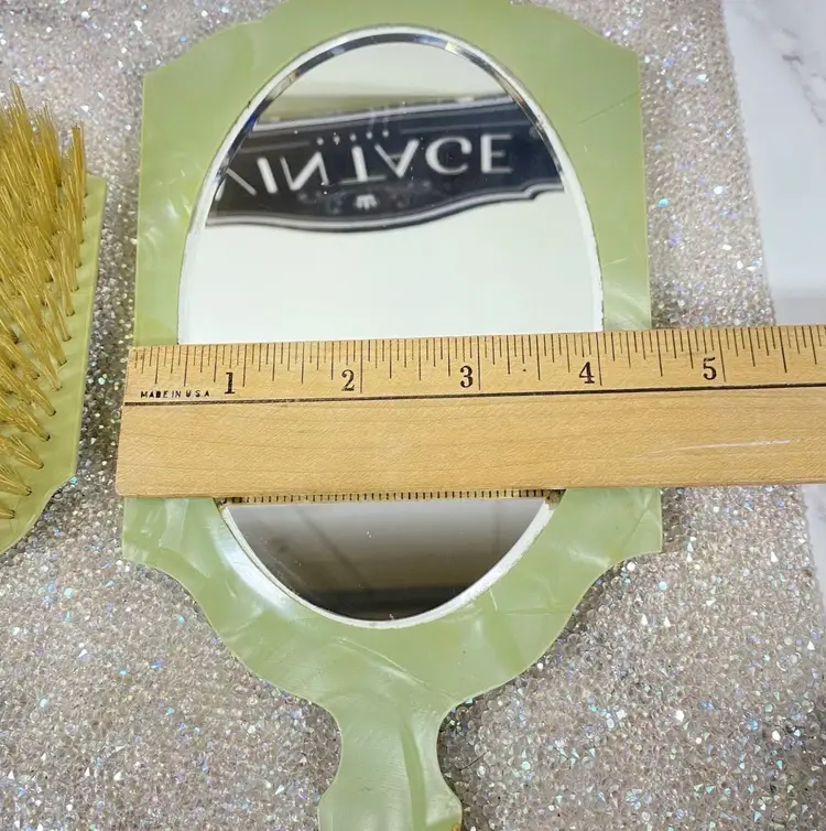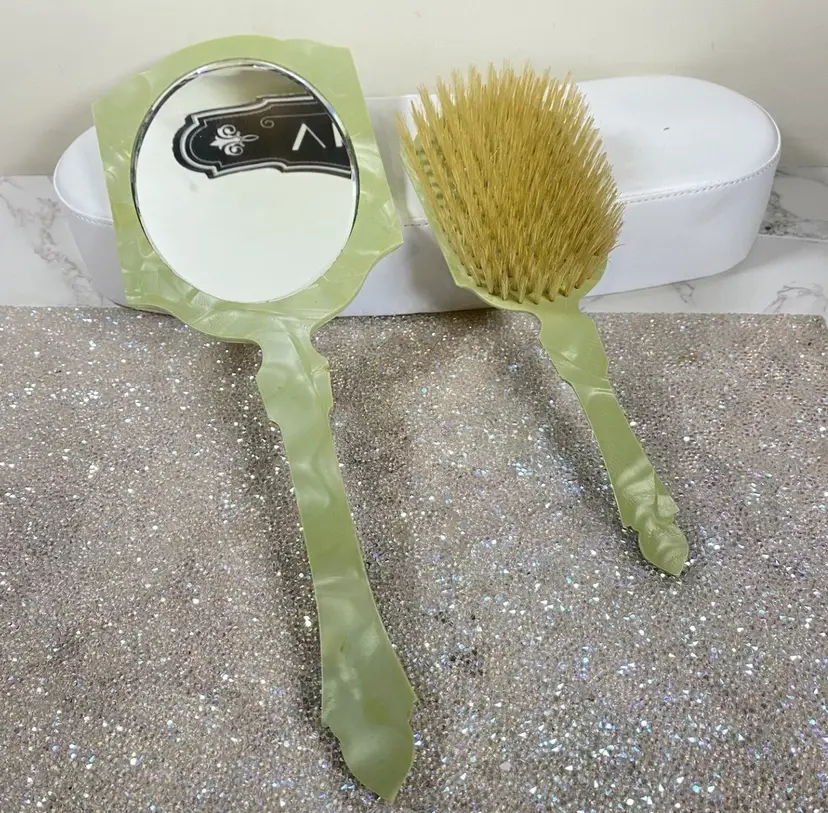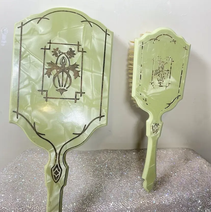 This Vintage Vanity Set is from The 1920s. Stunning addition to any Collection. This is a Super Rare find and has been taken care of. Made in the USA ๐บ๐ธ FOR AS OLD AS IT IS, Itโs GORGEOUS with Some Marks on back of the Hair Brush.