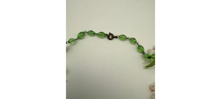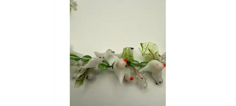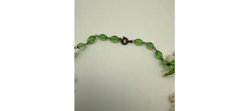 ITEM SPECIFICS Base color: Brass/gold-tone (untested costume jewelry) Maker’s Mark?: no Condition: Pre-owned condition. Clasp and wire are very worn. Glass leaves, birds, and other beads seem to be in good condition. Necklace Length: approx 18 inches Extender?: no Pendant?: No Weight: 1.7 ounces
