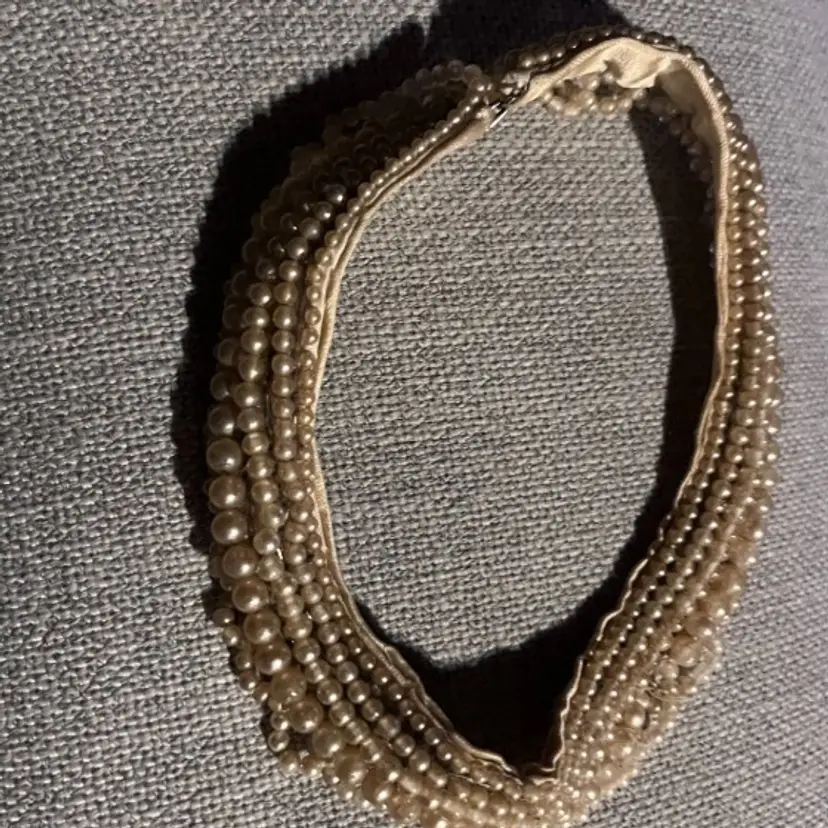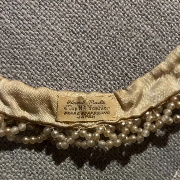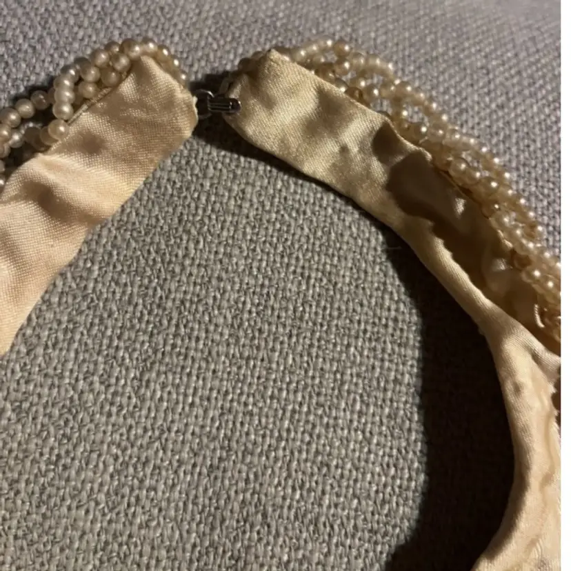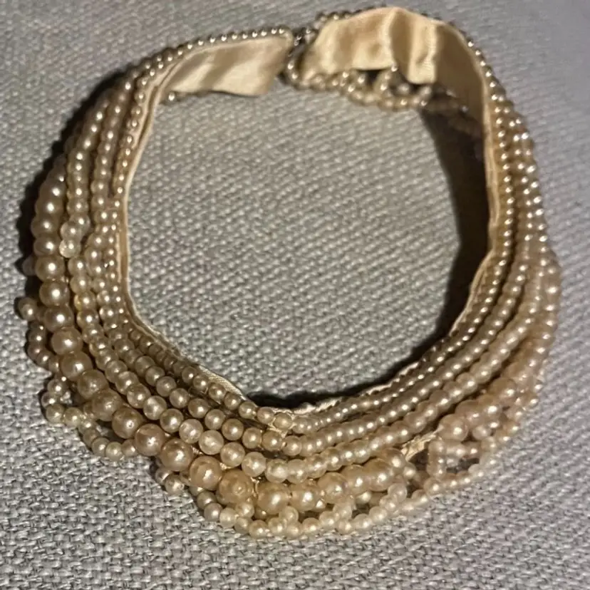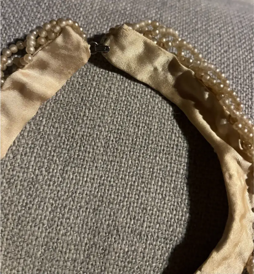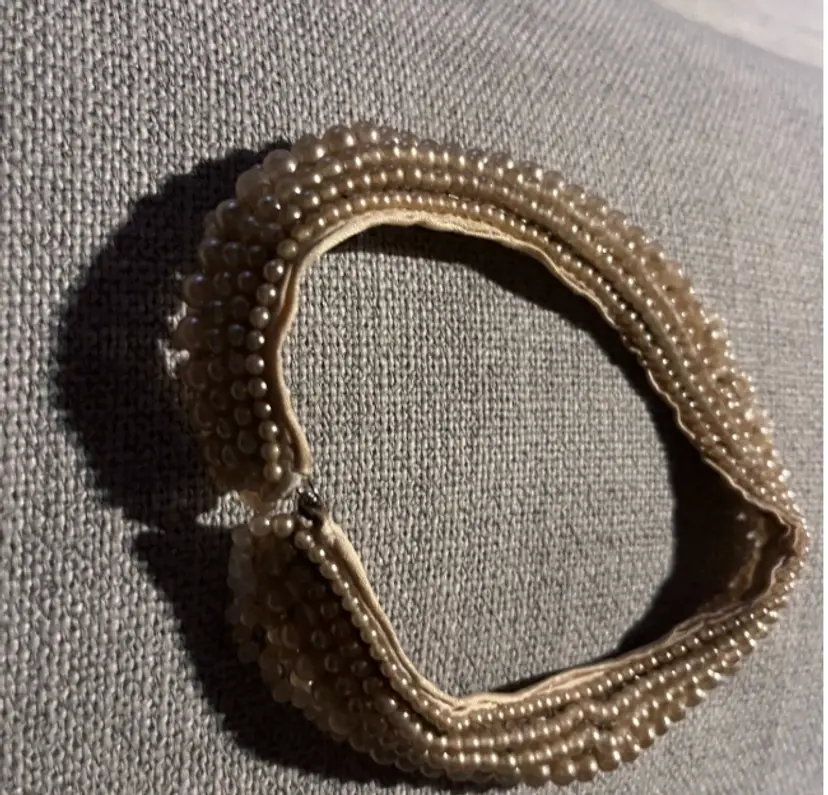 Gorgeous vintage Mid-Century Modern MCM Faux pearl collar. Approx 15" long. There are a couple of pearls missing in the front, on the bottom. Please see photos