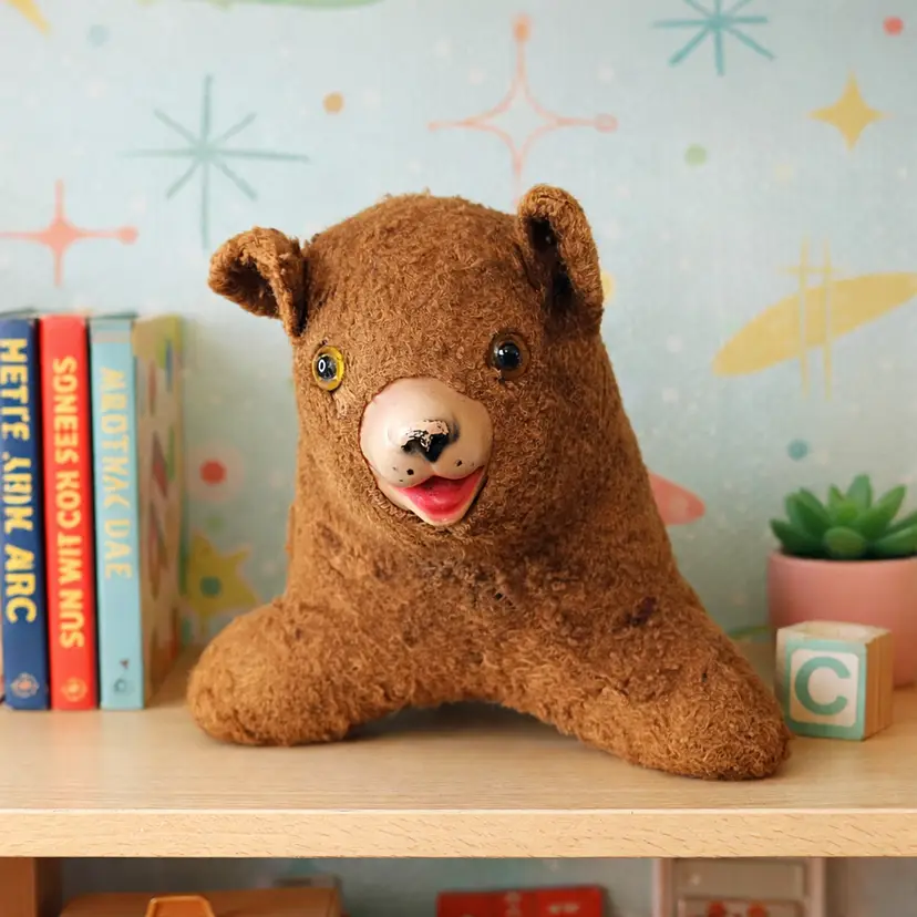 Vintage 1950s Rubber Face Musical Teddy Bear This is a charming mid-century "rubber face" teddy bear, a classic example of 1950s kitsch nursery decor. Similar in style to Rushton or Gund "Star Creation" dolls, this bear features a molded rubber face with hand-painted details.