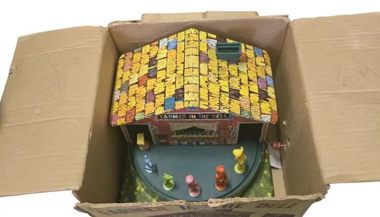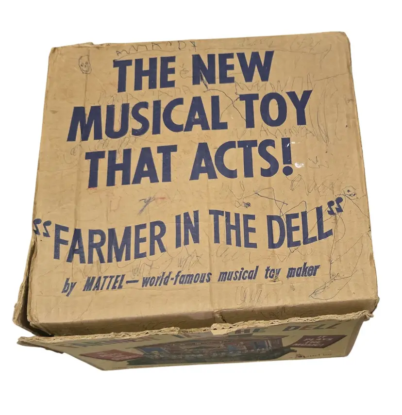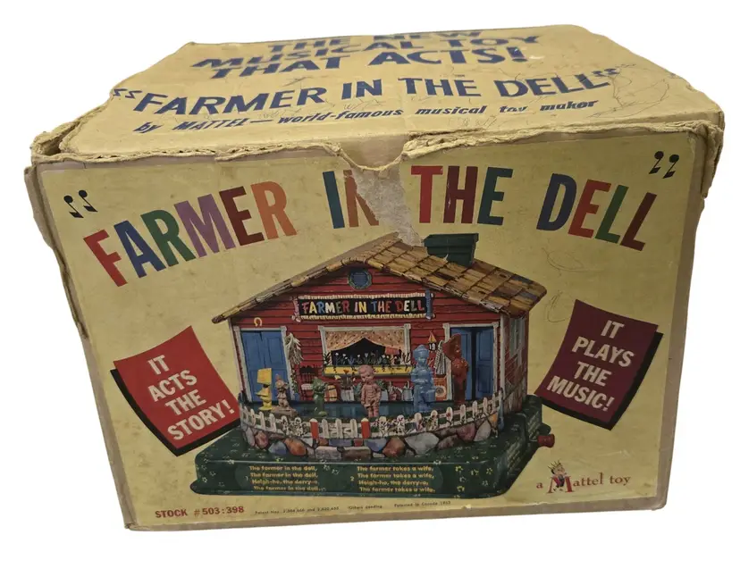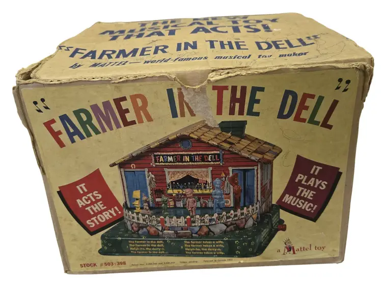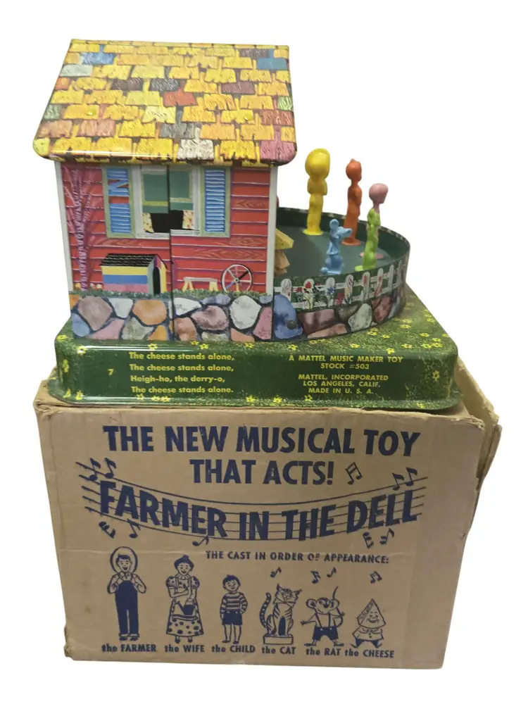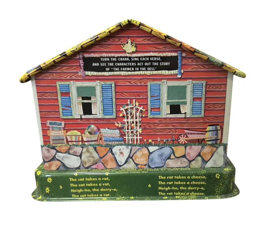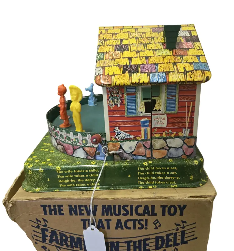 Vintage 1950's Tin Litho Wind Up Musical Farmer in the Dell with Original Box
