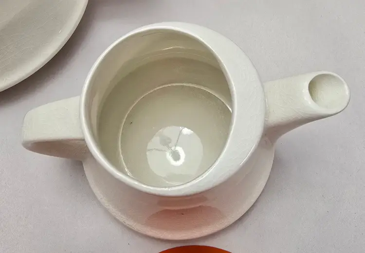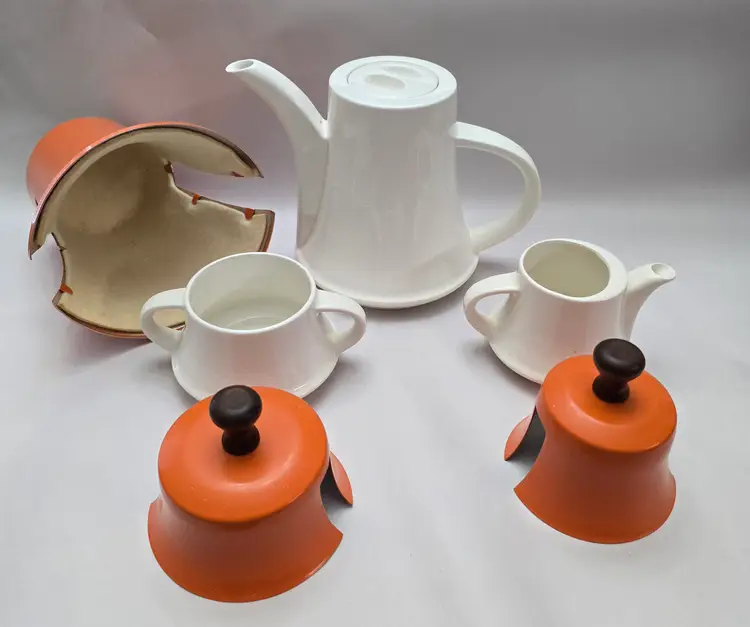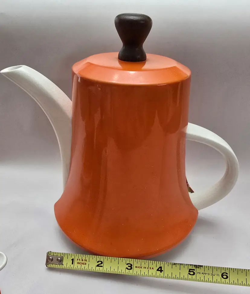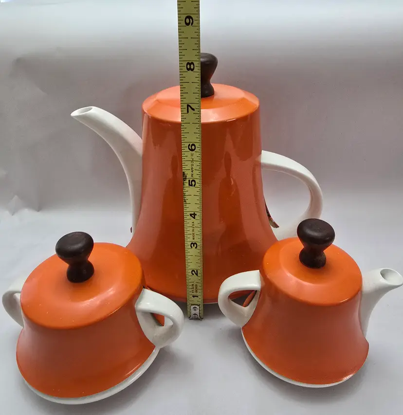This set includes coffee pot, cream,sugar. Ceramic with aluminum covers with wooden knobs. Has underglaze crazing due to age but no chips or cracks. Displays beautifully. Please look at pictures closely. Made in Japan.