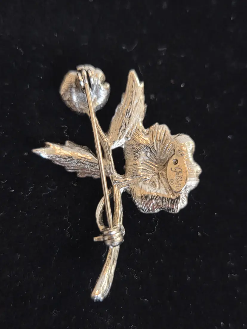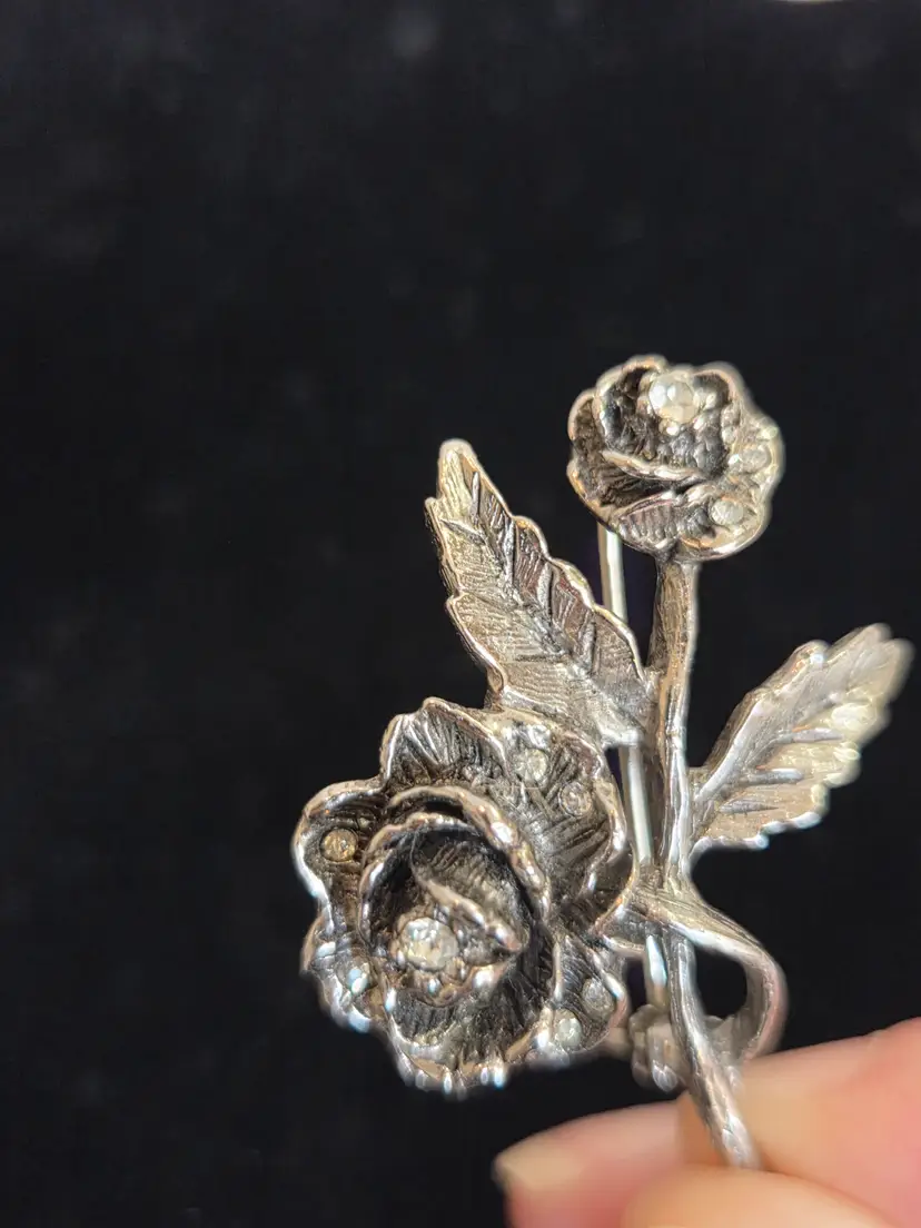 Vintage 1960's Goldette Silver Toned Rose Brooch with Rhinestones