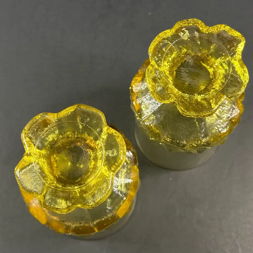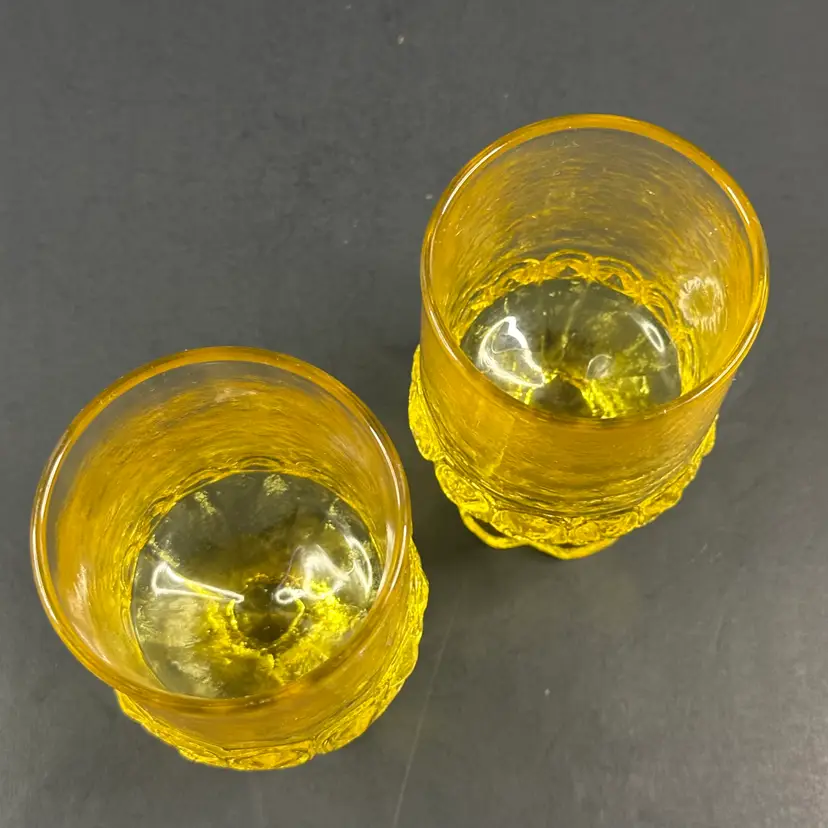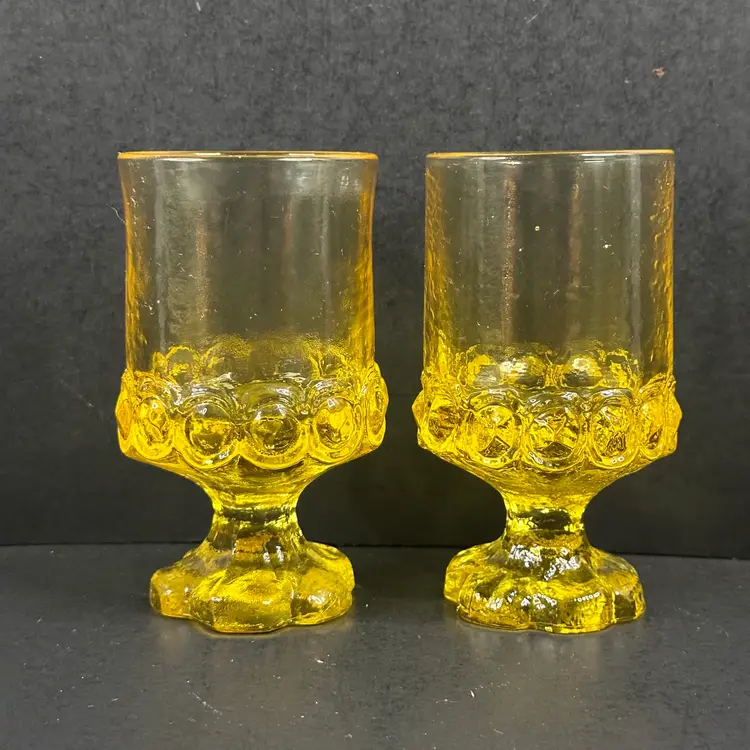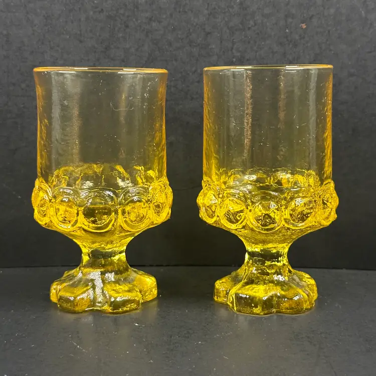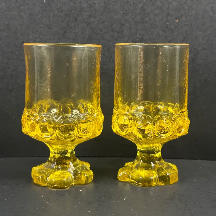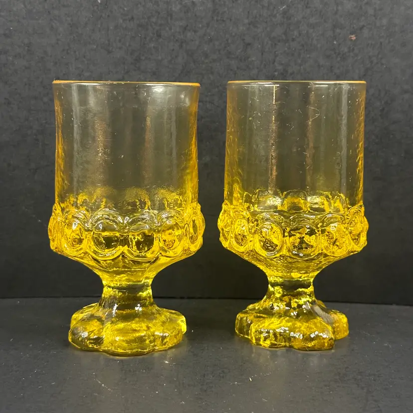 Vintage 1960's Tiffin Franciscan Footed Madeira Cornsilk Yellow Footed Glasses in good preowned condition. Each glass stands approximately 4 7/8 inches tall with a diameter of 2 1/2 inches. These glasses are heavy weighing nearly one pound a piece. No chips, nicks or cracks. Please see photos for all the details.