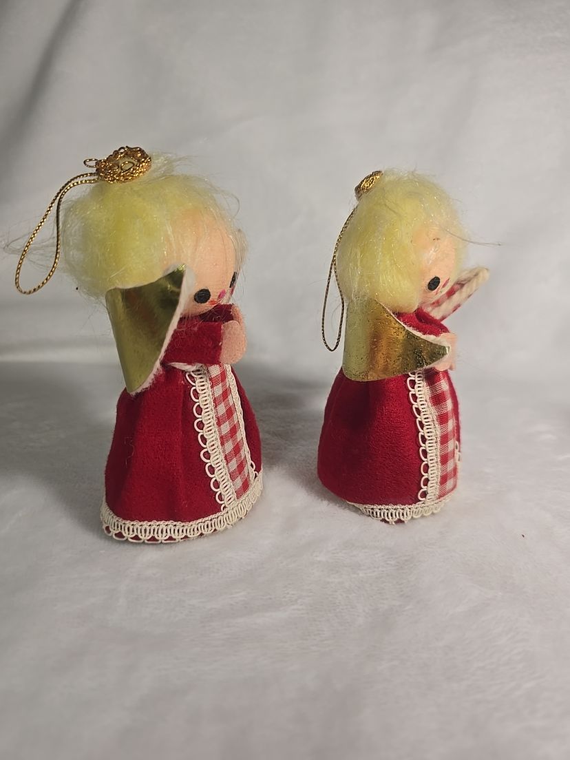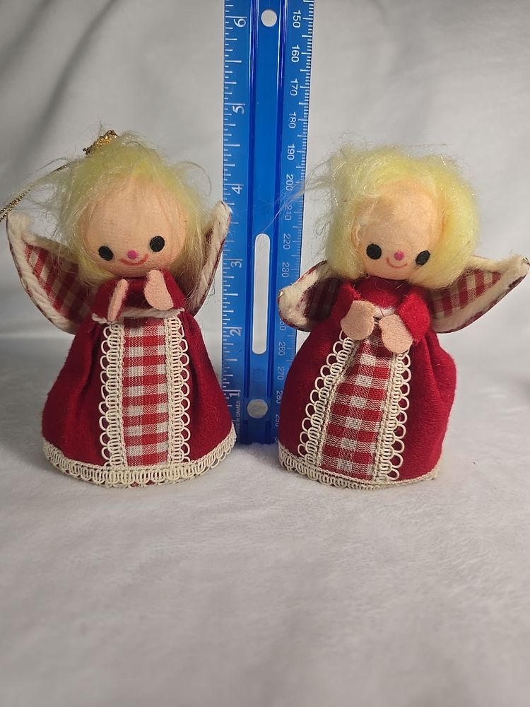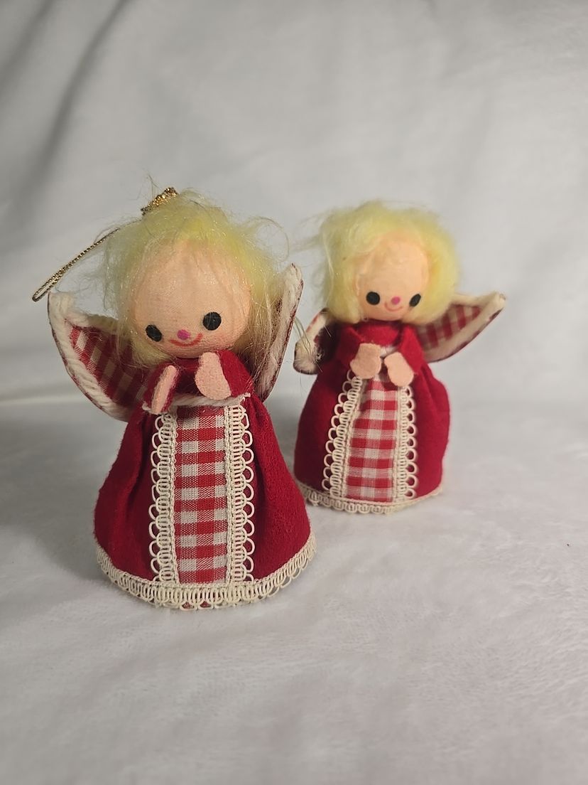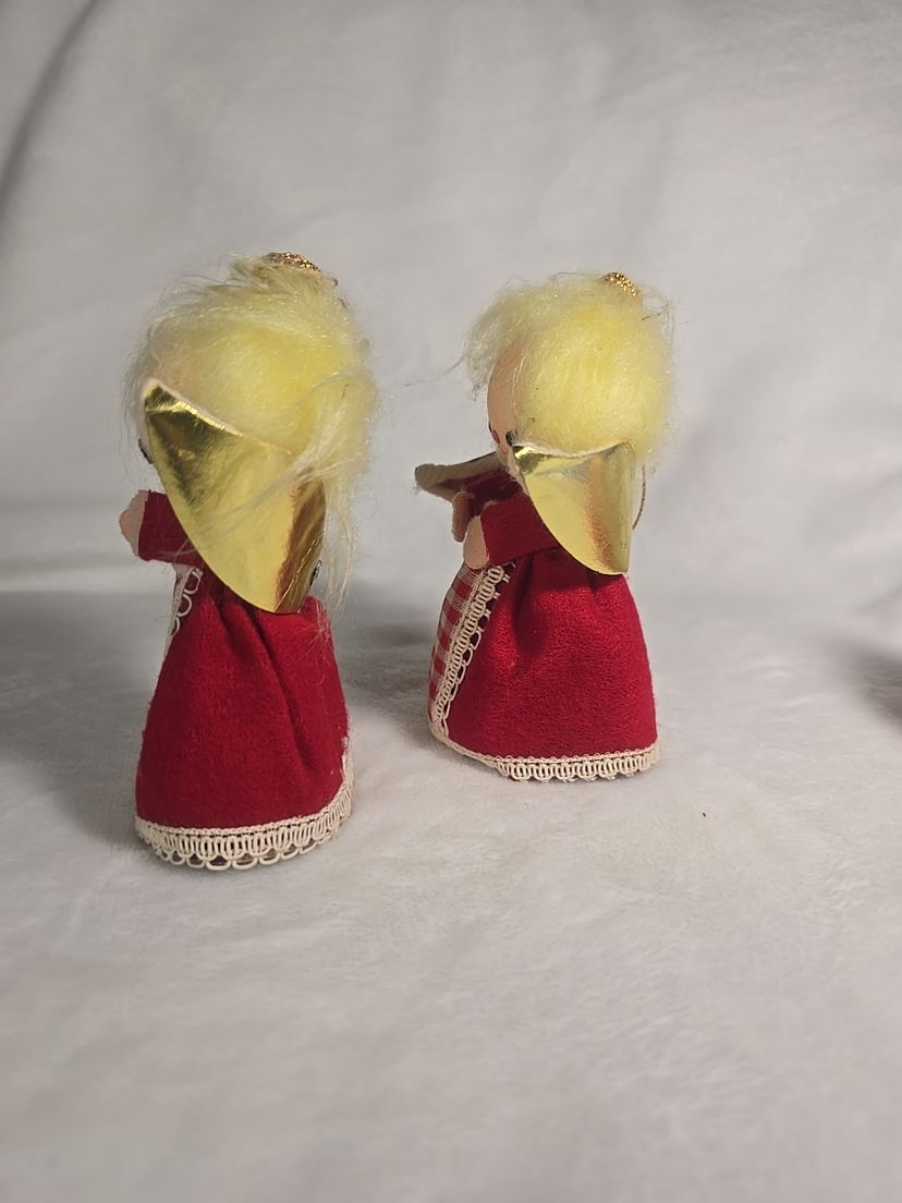 2 angels with soft sculpted heads, golden hair, and red fabric gowns trimmed with lace