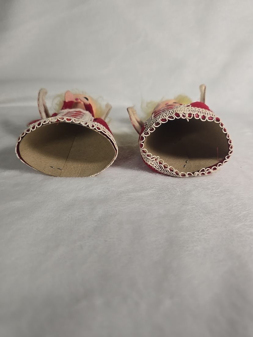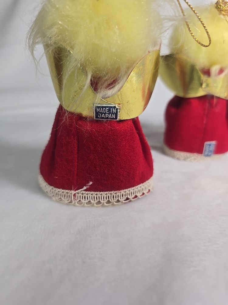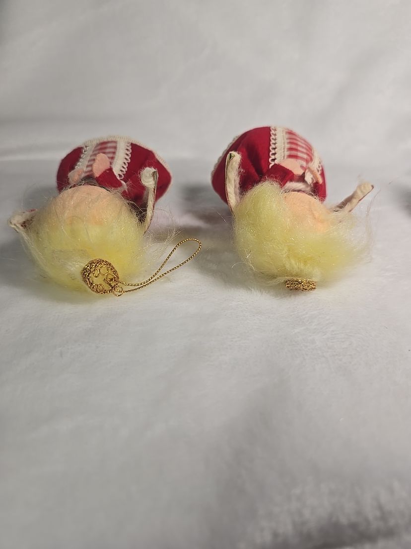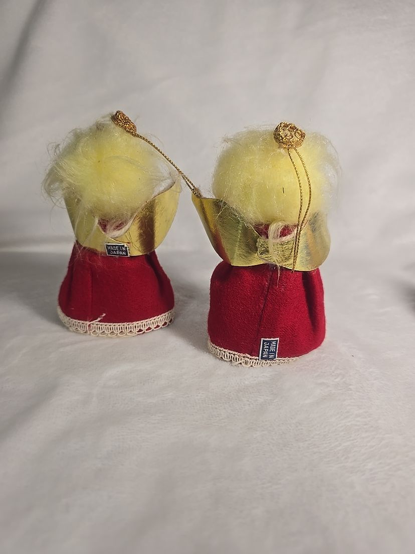 2 angels with soft sculpted heads, golden hair, and red fabric gowns trimmed with lace