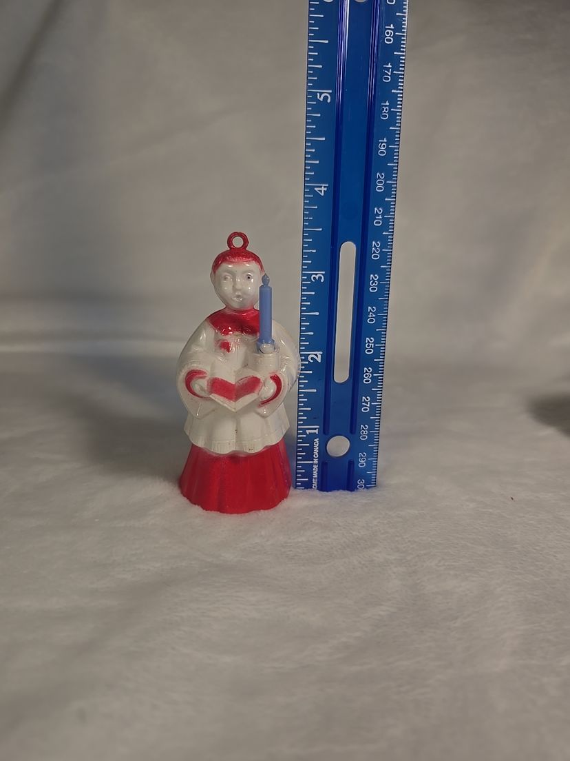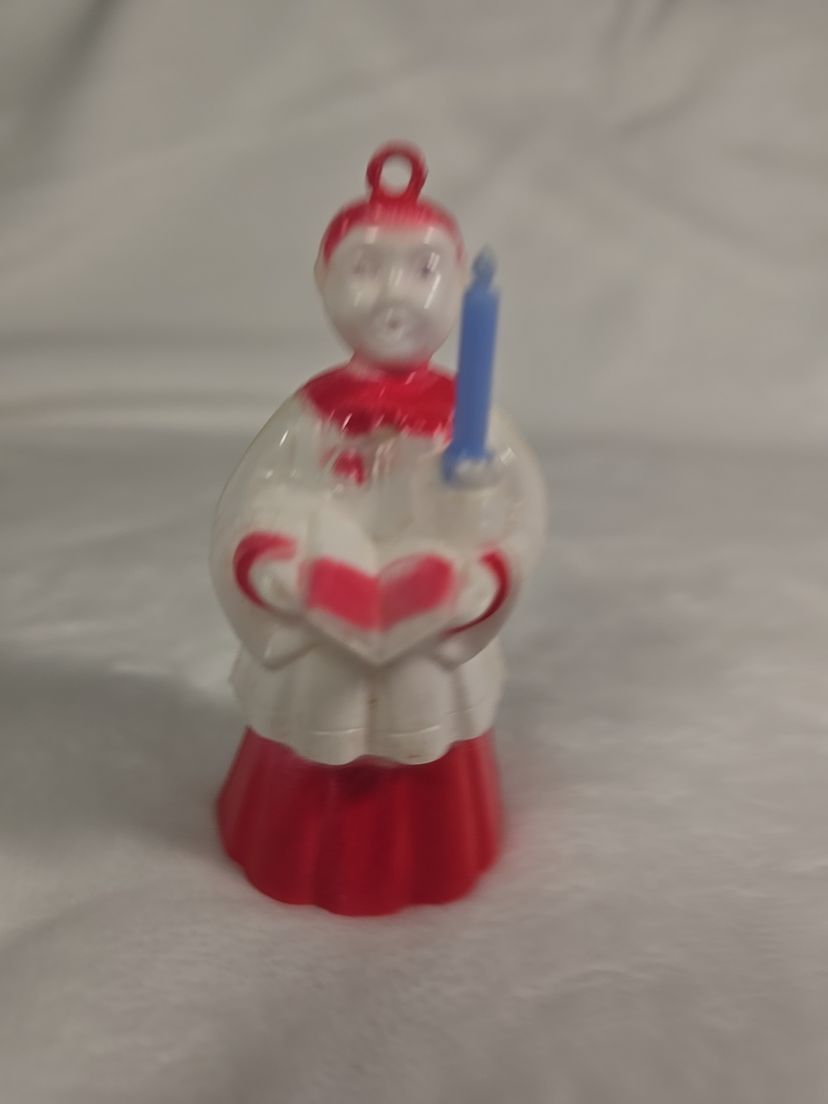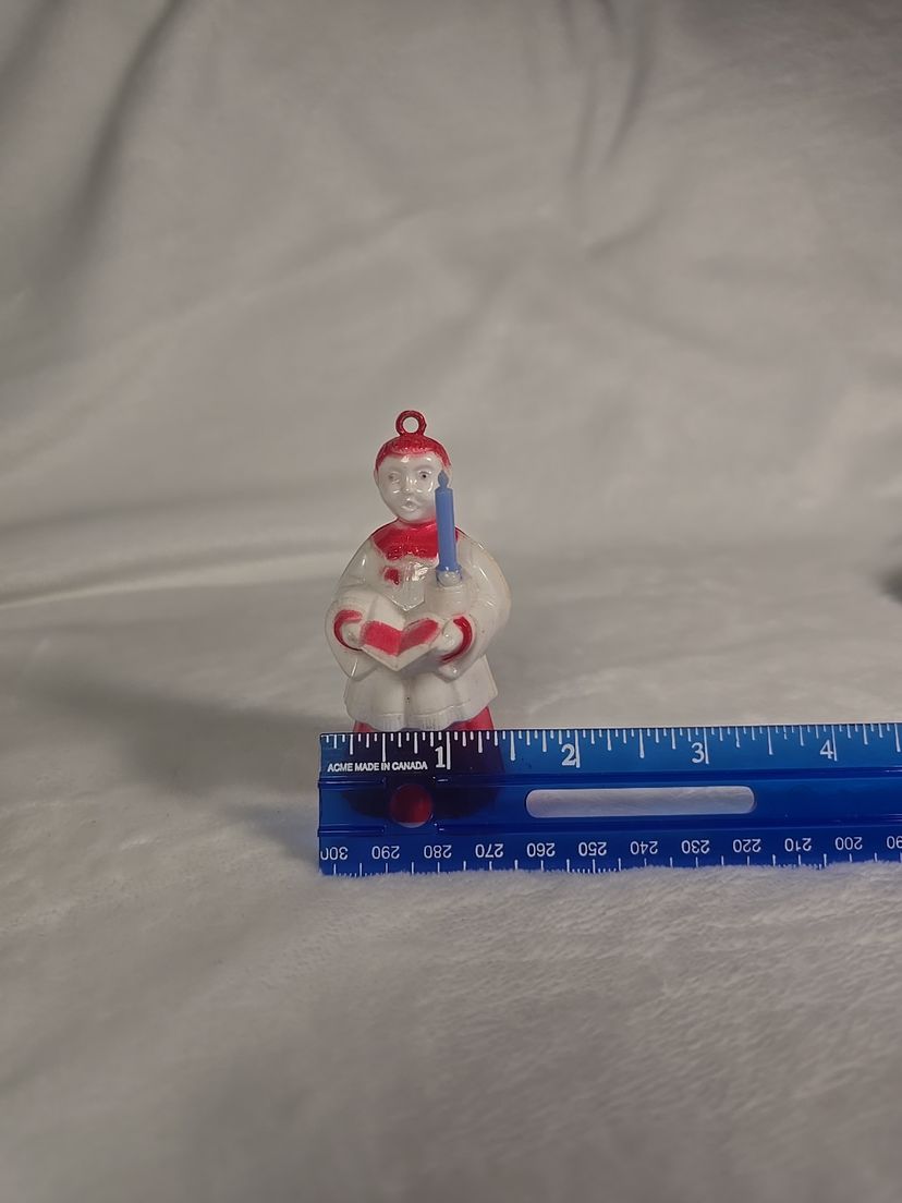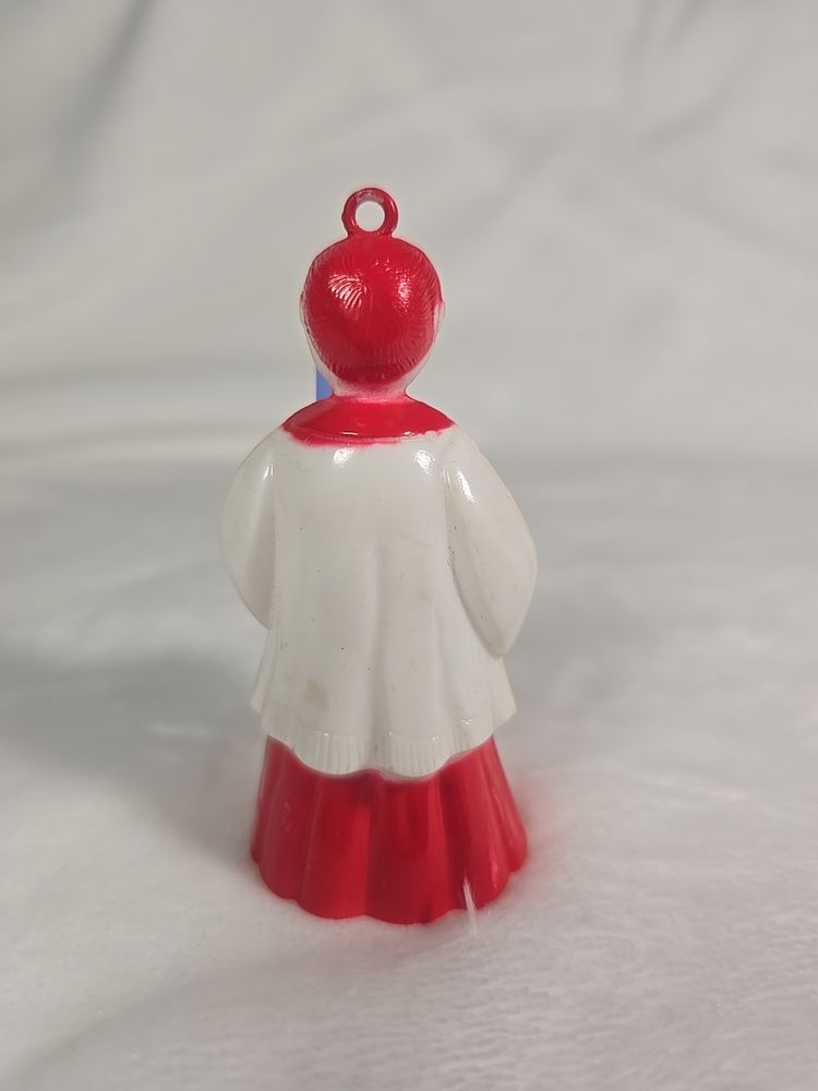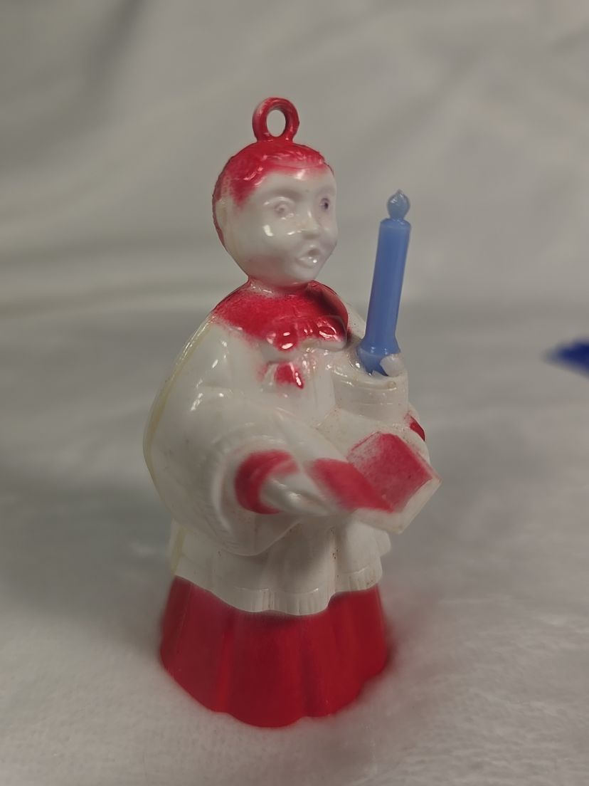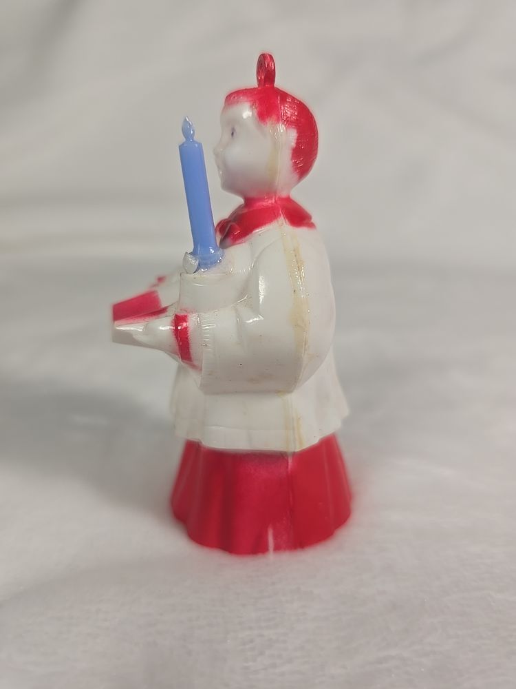 1 hard plastic (celluloid?) choir boy in red and white with blue candle