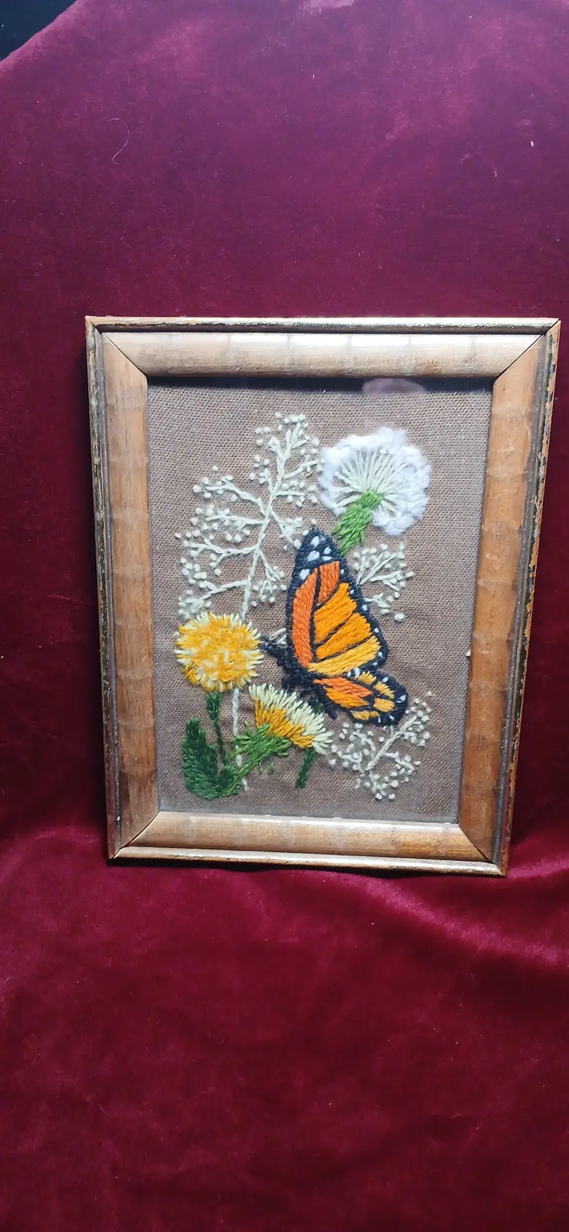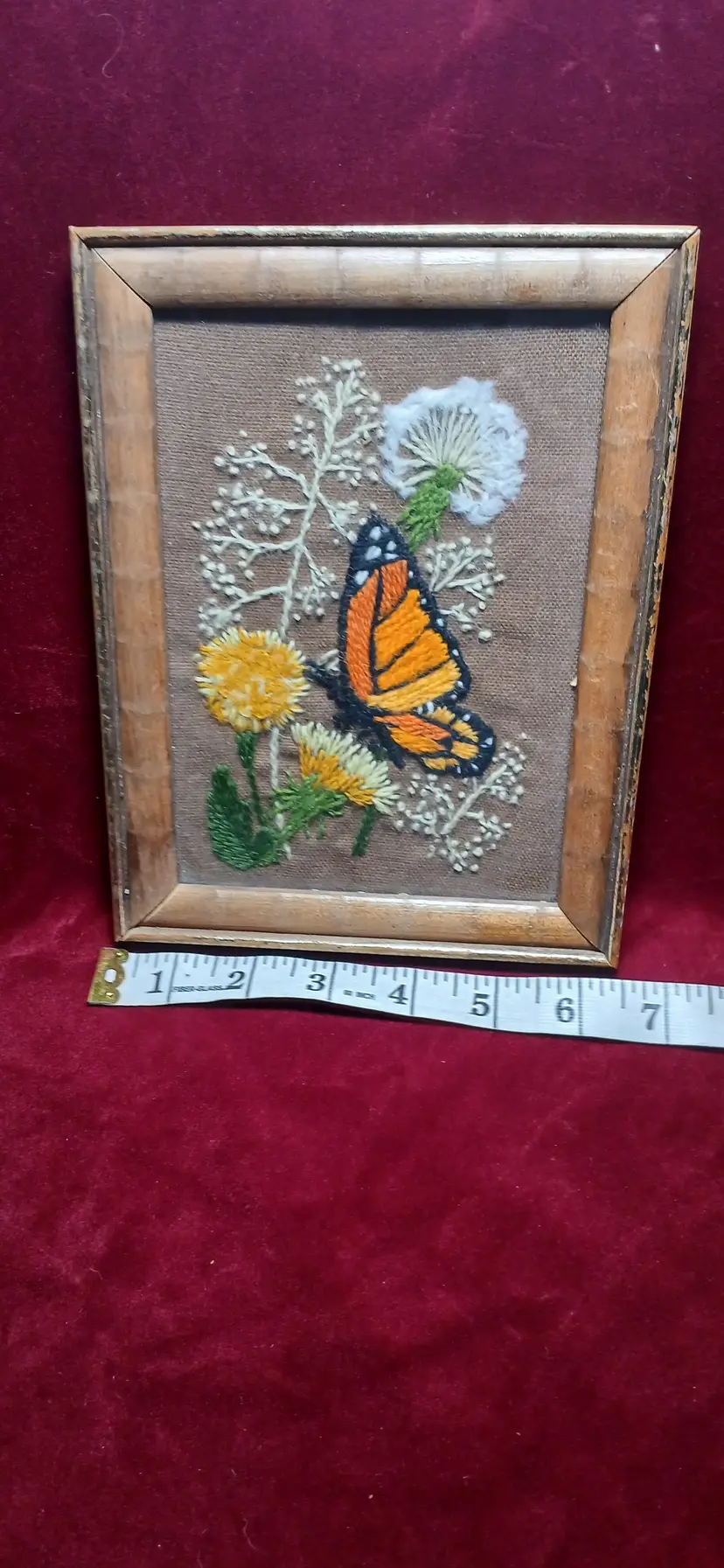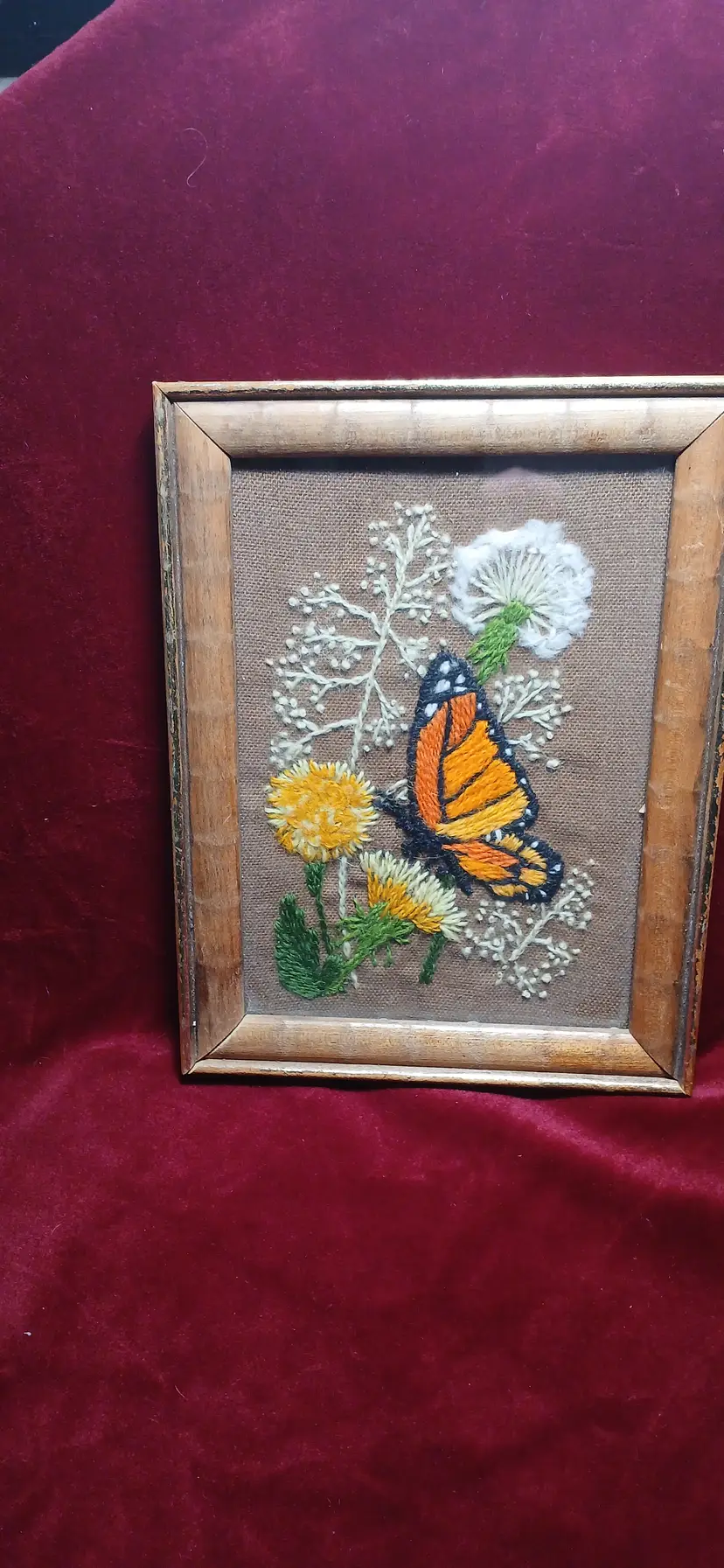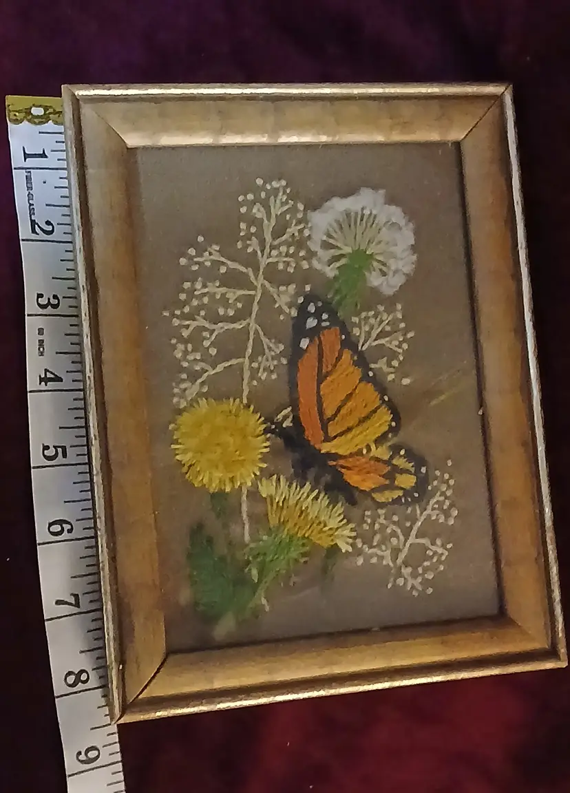 Lovely handmade piece. Beautiful monarch butterfly and dandelions. Frame is in ok condition. Easily removable . Please check out my other listings as I offer combined shipping!