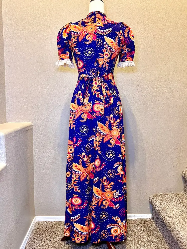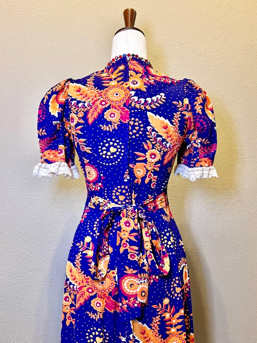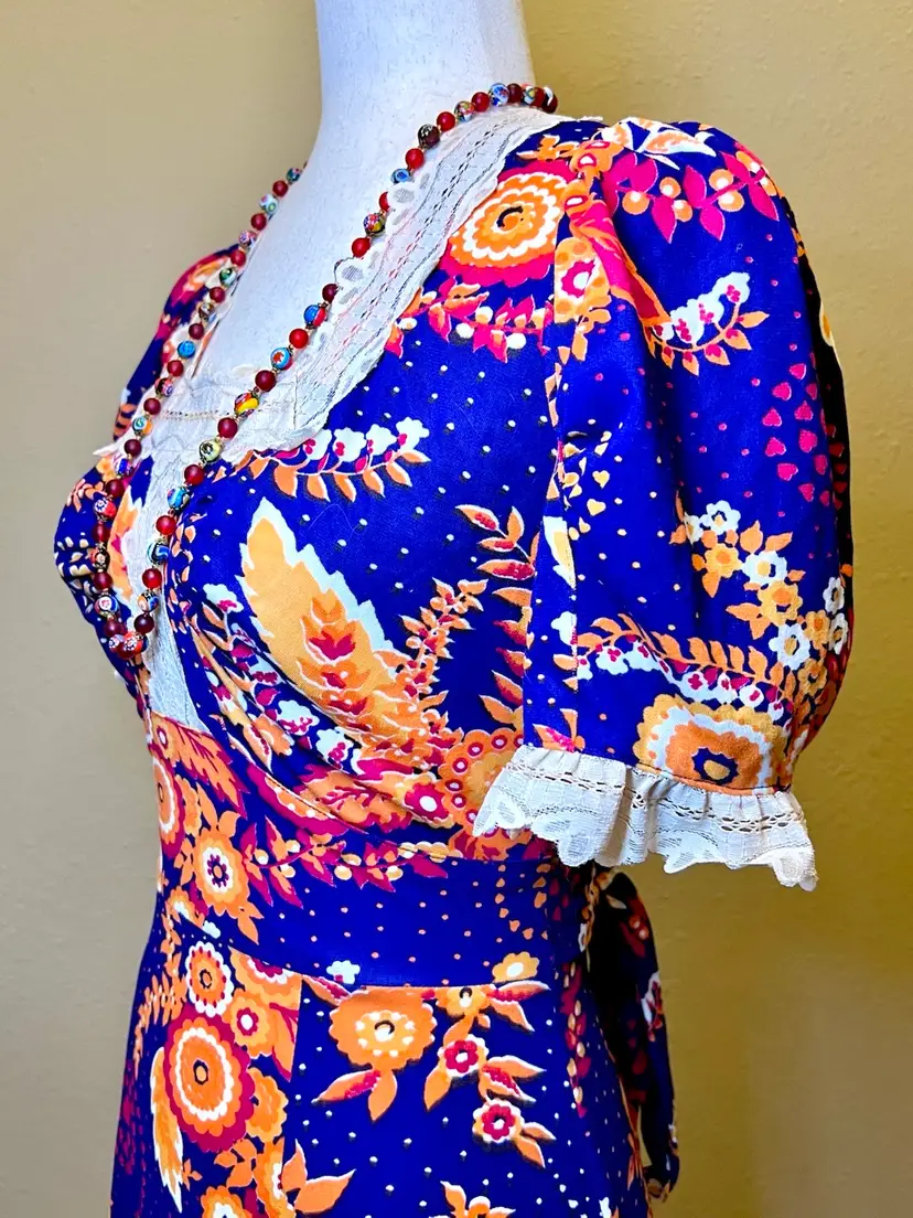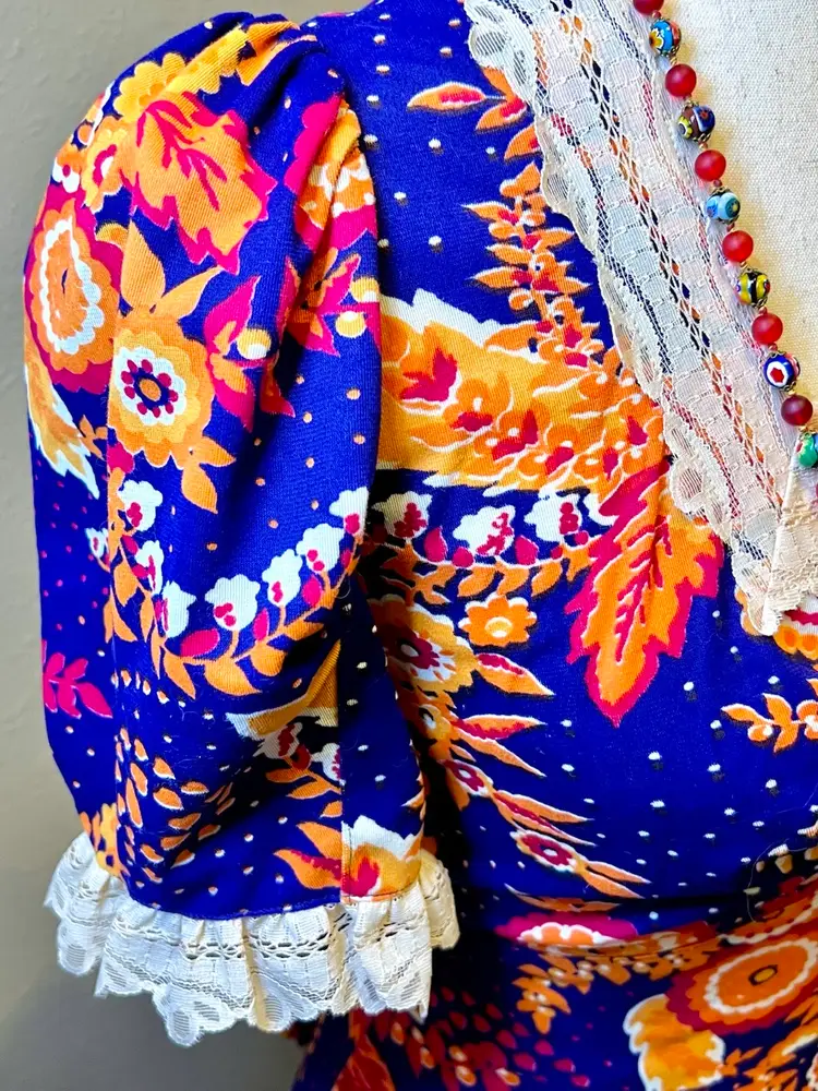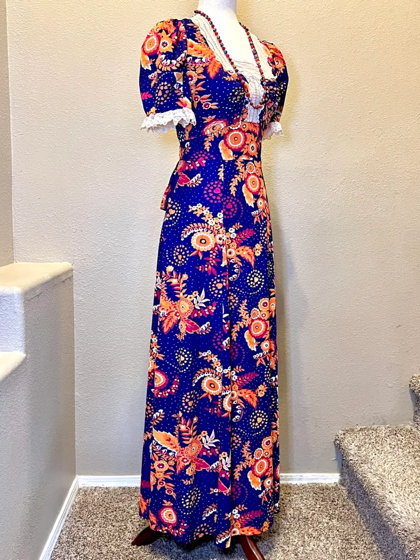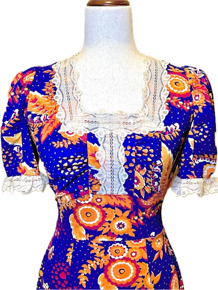 💟This fabulous piece is from my personal collection, but it’s time for her to find a new home! This vintage dress has lovely cream lace detail to the sleeves, bust and neckline. It zips and ties in the back. The print is so groovy! The material is polyester with a little bit of stretch to it, and the empire waist is so flattering! The puff sleeves are super cute! Wish my shoulders were less broad, so I could still wear it! 😭 This piece is in excellent vintage condition, with no noted flaws. **Passing thru a smoke-free, pet friendly home.