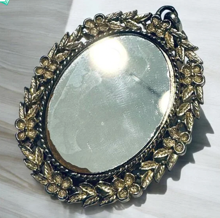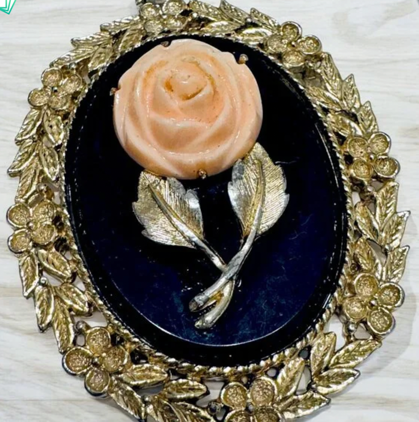 Vintage 1970's Large Cameo Pendant Black w/ Pink Rose Mirror Back Gold Accents by Svon In good preowned vintage condition Measuring 2.25 inches long 35 grams Can be put on a chain or a torque.